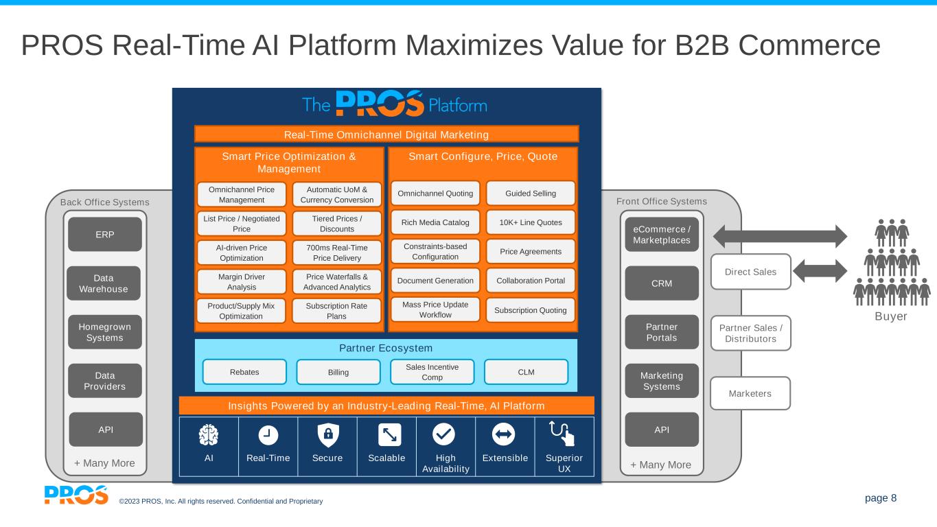 ©2023 PROS, Inc. All rights reserved. Confidential and Proprietary page 7 Siloed Applications Make It Difficult to Digitize, Automate and Apply AI to Deliver a Superior Shopping and Selling Experience Procurement Revenue Management Contract Lifecycle Management Product Information Management Back Office Systems ERP PSS Excel / Flat Files / Home Grown API + Many More Partner Sales / Distributors Direct Sales Independent Agents Marketers Business Intelligence / Analytics eCommerce / Marketplaces / OTA & MSE Partner Portals Agency Portals / GDS Marketing Systems + Many More API CRM Front Office Systems Product Configuration / Bundling Substitute Product Recommendations Product Availability Control Demand Forecasting Offer Optimization List Price Optimization Cost Optimization Negotiated Discount Recommendations Churn Detection Upsells Cross Sells Competitor Price Forecasting Artificial Intelligence Needs + Many More Trade Promotion Management Rebate Management List Price Management CPQ Digital Offer Marketing Internet Booking Engines Special Price Agreements / Renewals / Amendments Deal Desk Multi-modal, Omnichannel Catalog BillingPayments Buyer