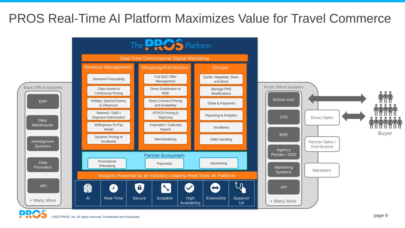©2023 PROS, Inc. All rights reserved. Confidential and Proprietary page 8 PROS Real-Time AI Platform Maximizes Value for B2B Commerce Back Office Systems ERP + Many More Partner Sales / Distributors Direct Sales Marketers eCommerce / Marketplaces Partner Portals Marketing Systems + Many More API CRM Front Office Systems AI Real-Time Secure Scalable High Availability Extensible Superior UX Insights Powered by an Industry-Leading Real-Time, AI Platform Real-Time Omnichannel Digital Marketing Smart Configure, Price, QuoteSmart Price Optimization & Management Partner Ecosystem Omnichannel Price Management Automatic UoM & Currency Conversion List Price / Negotiated Price Tiered Prices / Discounts AI-driven Price Optimization 700ms Real-Time Price Delivery Margin Driver Analysis Price Waterfalls & Advanced Analytics Omnichannel Quoting Guided Selling Rich Media Catalog 10K+ Line Quotes Constraints-based Configuration Price Agreements Document Generation Collaboration Portal Rebates Billing CLM Product/Supply Mix Optimization Subscription Rate Plans Mass Price Update Workflow Subscription Quoting Sales Incentive Comp Data Warehouse Homegrown Systems API Data Providers Buyer