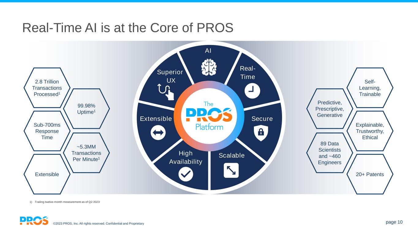 ©2023 PROS, Inc. All rights reserved. Confidential and Proprietary page 9 PROS Real-Time AI Platform Maximizes Value for Travel Commerce Partner Sales / Distributors Direct Sales Marketers Airline.com Marketing Systems + Many More API Front Office Systems AI Real-Time Secure Scalable High Availability Extensible Superior UX Real-Time Omnichannel Digital Marketing Partner Ecosystem Agency Portals / GDS OTA MSE Revenue Management Shopping/Distribution Groups Demand Forecasting Class-based or Continuous Pricing Holiday, Special Events, & Influences Network / O&D / Segment Optimization Willingness-To-Pay Model Dynamic Pricing of Ancillaries Quote, Negotiate, Save, and Book Manage PNR Modifications Ticket & Payments Reporting & Analytics Ancillaries EMD Handling Full NDC Offer Management Direct Distribution to MSE Direct Connect Pricing and Availability ATPCO Pricing & Repricing Inspiration / Calendar Search Merchandising Promotional Rebooking Payments Advertising Back Office Systems ERP + Many More Data Warehouse Homegrown Systems API Data Providers Buyer Insights Powered by an Industry-Leading Real-Time, AI Platform