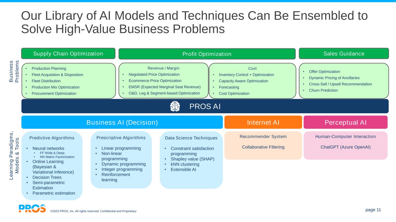 ©2023 PROS, Inc. All rights reserved. Confidential and Proprietary page 10 Real-Time AI is at the Core of PROS Self- Learning, Trainable Predictive, Prescriptive, Generative Explainable, Trustworthy, Ethical 89 Data Scientists and ~460 Engineers 20+ Patents 2.8 Trillion Transactions Processed1 99.98% Uptime1 Sub-700ms Response Time ~5.3MM Transactions Per Minute1 Extensible Real- Time Secure ScalableHigh Availability Superior UX Extensible AI 1) Trailing twelve-month measurement as of Q2 2023