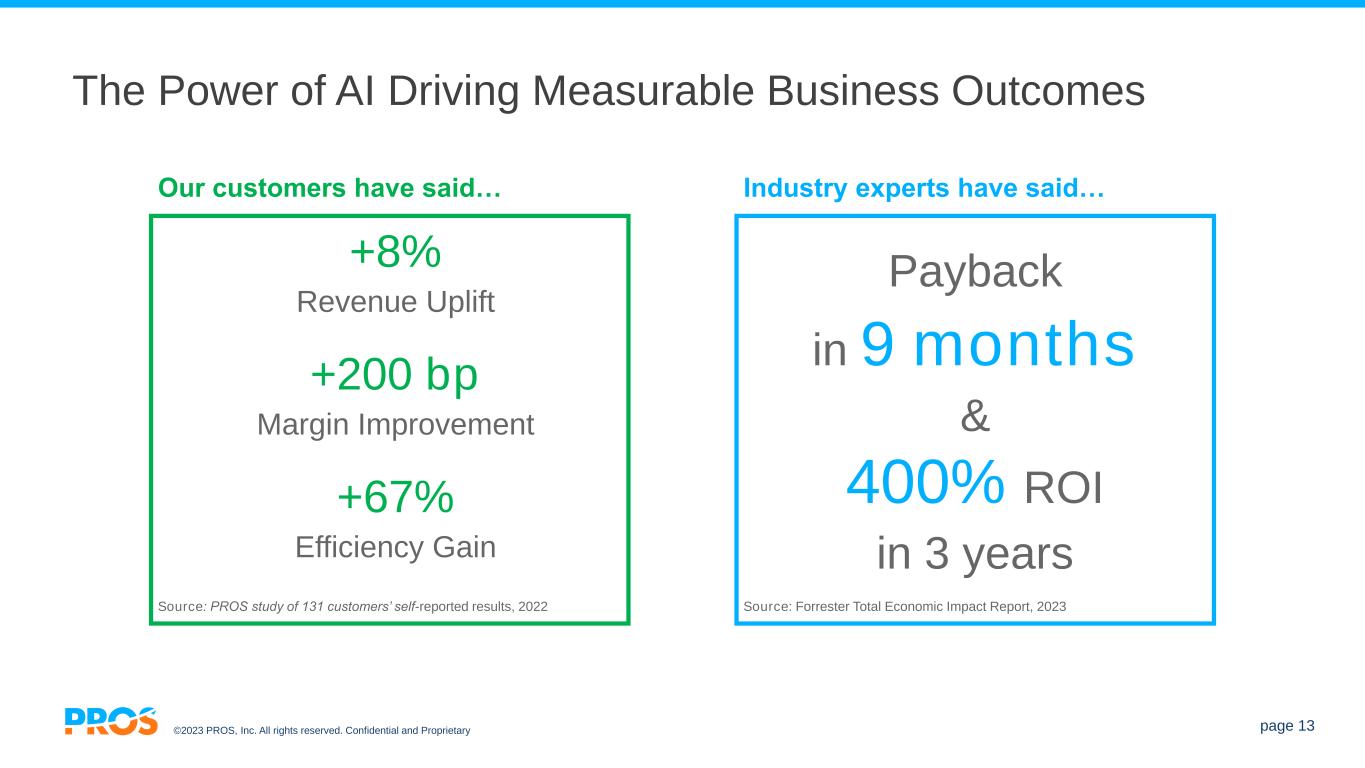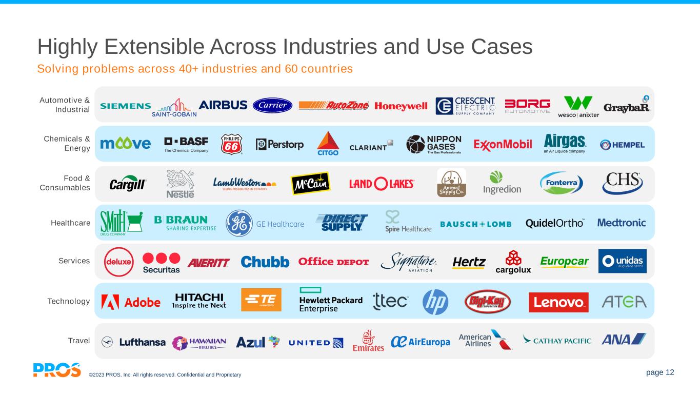 ©2023 PROS, Inc. All rights reserved. Confidential and Proprietary page 12 Highly Extensible Across Industries and Use Cases Solving problems across 40+ industries and 60 countries Travel Technology Chemicals & Energy Healthcare Food & Consumables Services Automotive & Industrial