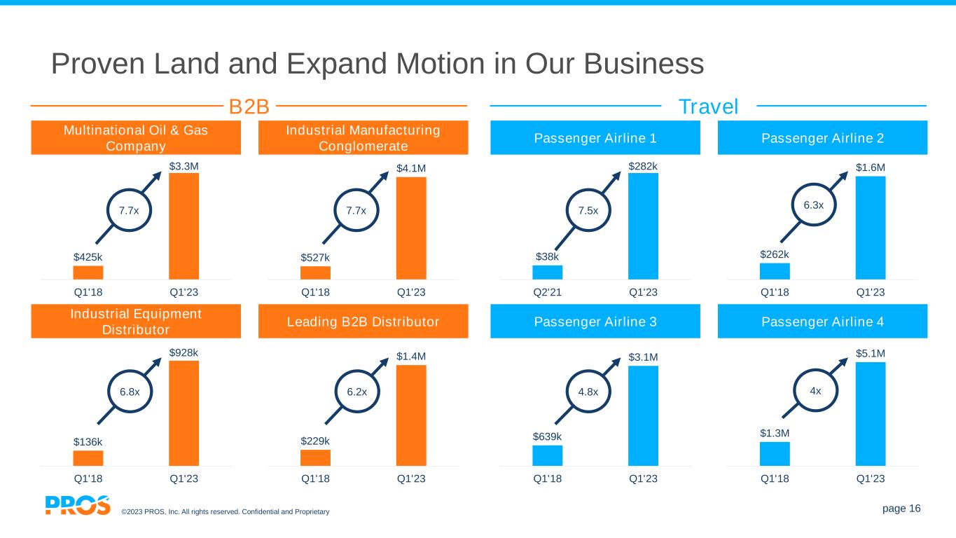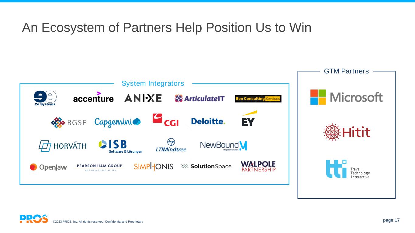 ©2023 PROS, Inc. All rights reserved. Confidential and Proprietary page 16 Proven Land and Expand Motion in Our Business $38k $282k Q2'21 Q1'23 7.5x $639k $3.1M Q1'18 Q1'23 Passenger Airline 3 4.8x $262k $1.6M Q1'18 Q1'23 6.3x $1.3M $5.1M Q1'18 Q1'23 Passenger Airline 4 4x $425k $3.3M Q1'18 Q1'23 7.7x $136k $928k Q1'18 Q1'23 Industrial Equipment Distributor 6.8x $527k $4.1M Q1'18 Q1'23 7.7x $229k $1.4M Q1'18 Q1'23 Leading B2B Distributor 6.2x TravelB2B Passenger Airline 1 Passenger Airline 2 Multinational Oil & Gas Company Industrial Manufacturing Conglomerate