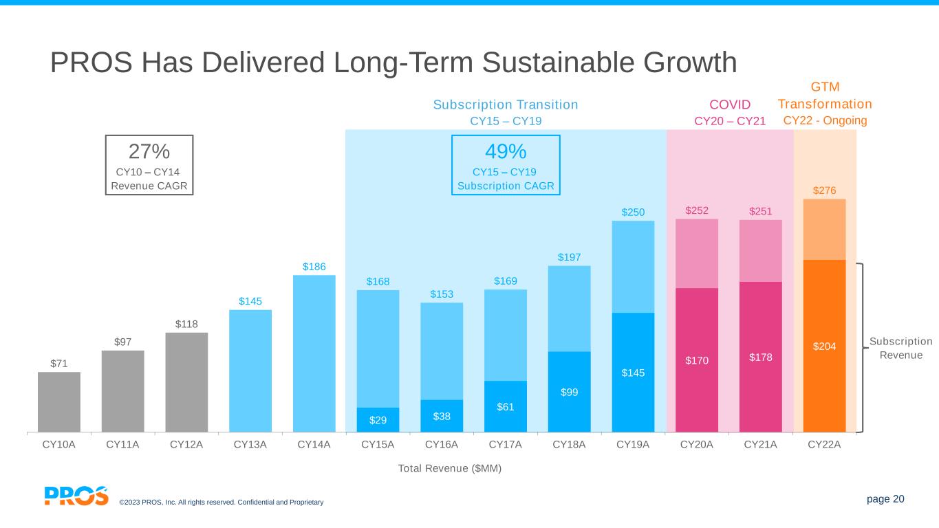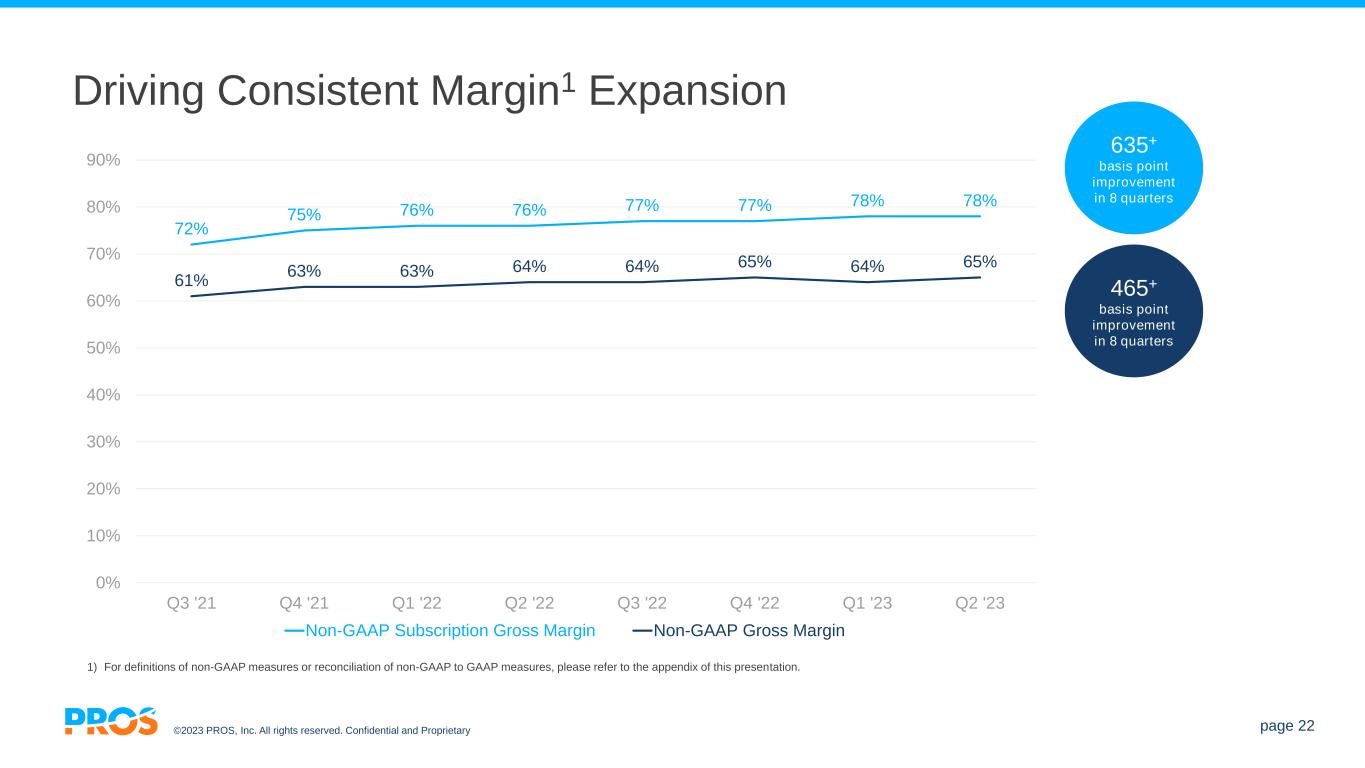 ©2023 PROS, Inc. All rights reserved. Confidential and Proprietary page 21 Subscription Revenue Growth Trajectory ($mm, % YoY Growth) • 27% 5-Year CAGR (2017 through 2022) • Continued growth through the COVID-19 pandemic 1) 2023 dollar value and growth rate based on the mid-point of the Subscription Revenue 2023 Guidance. 2023 expectations are forward-looking statements. Given the risks, uncertainties and assumptions related to PROS’ business and operations, PROS’ actual future results may differ materially from these expectations. Investors should review the Company’s cautionary statements and risk factors referred to in this presentation. 60.5 98.7 145.3 170.5 178.0 204.0 232.7 2017 2018 2019 2020 2021 2022 2023E 49% 17% 47% 4% 15% 1 14%
