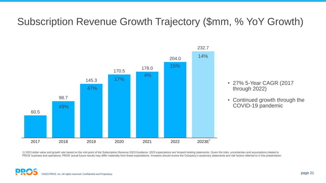 ©2023 PROS, Inc. All rights reserved. Confidential and Proprietary page 20 PROS Has Delivered Long-Term Sustainable Growth $29 $38 $61 $99 $145 $170 $178 $204 $71 $97 $118 $145 $186 $168 $153 $169 $197 $250 $252 $251 $276 CY10A CY11A CY12A CY13A CY14A CY15A CY16A CY17A CY18A CY19A CY20A CY21A CY22A Total Revenue ($MM) Subscription Transition CY15 – CY19 GTM Transformation CY22 - Ongoing 49% CY15 – CY19 Subscription CAGR COVID CY20 – CY21 27% CY10 – CY14 Revenue CAGR Subscription Revenue