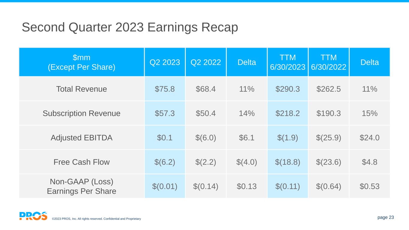 ©2023 PROS, Inc. All rights reserved. Confidential and Proprietary page 22 Driving Consistent Margin1 Expansion 1) For definitions of non-GAAP measures or reconciliation of non-GAAP to GAAP measures, please refer to the appendix of this presentation. 635+ basis point improvement in 8 quarters 465+ basis point improvement in 8 quarters 72% 75% 76% 76% 77% 77% 78% 78% 61% 63% 63% 64% 64% 65% 64% 65% 0% 10% 20% 30% 40% 50% 60% 70% 80% 90% Q3 '21 Q4 '21 Q1 '22 Q2 '22 Q3 '22 Q4 '22 Q1 '23 Q2 '23 Non-GAAP Subscription Gross Margin Non-GAAP Gross Margin