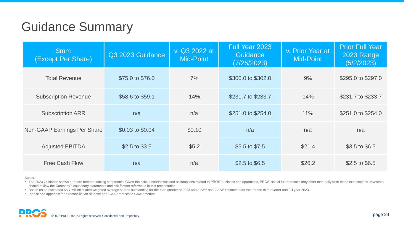 ©2023 PROS, Inc. All rights reserved. Confidential and Proprietary page 23 Second Quarter 2023 Earnings Recap $mm (Except Per Share) Q2 2023 Q2 2022 Delta TTM 6/30/2023 TTM 6/30/2022 Delta Total Revenue $75.8 $68.4 11% $290.3 $262.5 11% Subscription Revenue $57.3 $50.4 14% $218.2 $190.3 15% Adjusted EBITDA $0.1 $(6.0) $6.1 $(1.9) $(25.9) $24.0 Free Cash Flow $(6.2) $(2.2) $(4.0) $(18.8) $(23.6) $4.8 Non-GAAP (Loss) Earnings Per Share $(0.01) $(0.14) $0.13 $(0.11) $(0.64) $0.53