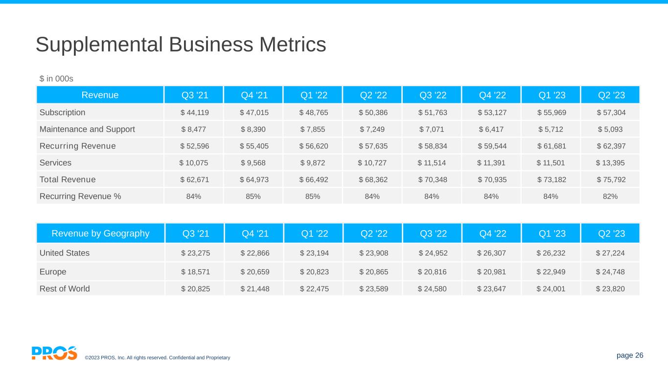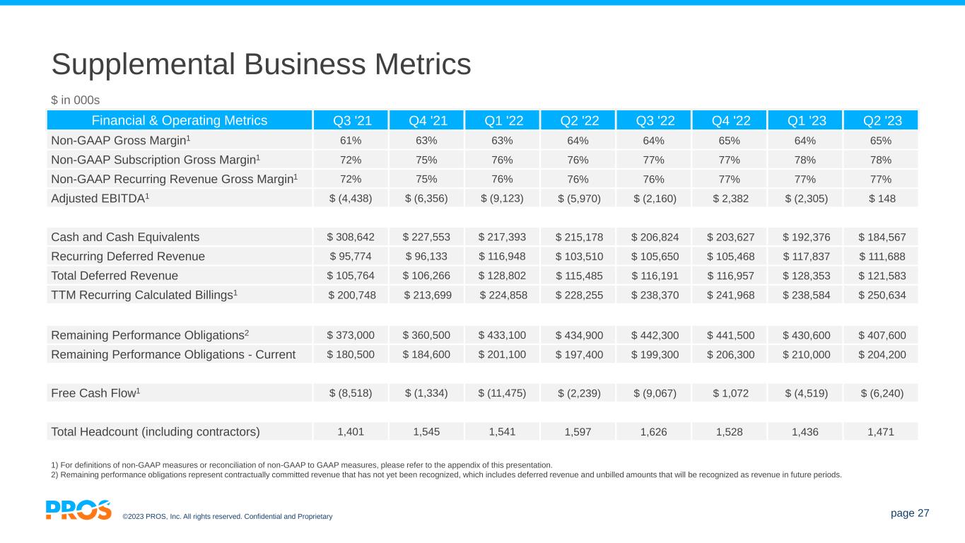 ©2023 PROS, Inc. All rights reserved. Confidential and Proprietary page 26 Supplemental Business Metrics Revenue Q3 '21 Q4 '21 Q1 '22 Q2 '22 Q3 '22 Q4 '22 Q1 '23 Q2 '23 Subscription $ 44,119 $ 47,015 $ 48,765 $ 50,386 $ 51,763 $ 53,127 $ 55,969 $ 57,304 Maintenance and Support $ 8,477 $ 8,390 $ 7,855 $ 7,249 $ 7,071 $ 6,417 $ 5,712 $ 5,093 Recurring Revenue $ 52,596 $ 55,405 $ 56,620 $ 57,635 $ 58,834 $ 59,544 $ 61,681 $ 62,397 Services $ 10,075 $ 9,568 $ 9,872 $ 10,727 $ 11,514 $ 11,391 $ 11,501 $ 13,395 Total Revenue $ 62,671 $ 64,973 $ 66,492 $ 68,362 $ 70,348 $ 70,935 $ 73,182 $ 75,792 Recurring Revenue % 84% 85% 85% 84% 84% 84% 84% 82% Revenue by Geography Q3 '21 Q4 '21 Q1 '22 Q2 '22 Q3 '22 Q4 '22 Q1 '23 Q2 '23 United States $ 23,275 $ 22,866 $ 23,194 $ 23,908 $ 24,952 $ 26,307 $ 26,232 $ 27,224 Europe $ 18,571 $ 20,659 $ 20,823 $ 20,865 $ 20,816 $ 20,981 $ 22,949 $ 24,748 Rest of World $ 20,825 $ 21,448 $ 22,475 $ 23,589 $ 24,580 $ 23,647 $ 24,001 $ 23,820 $ in 000s