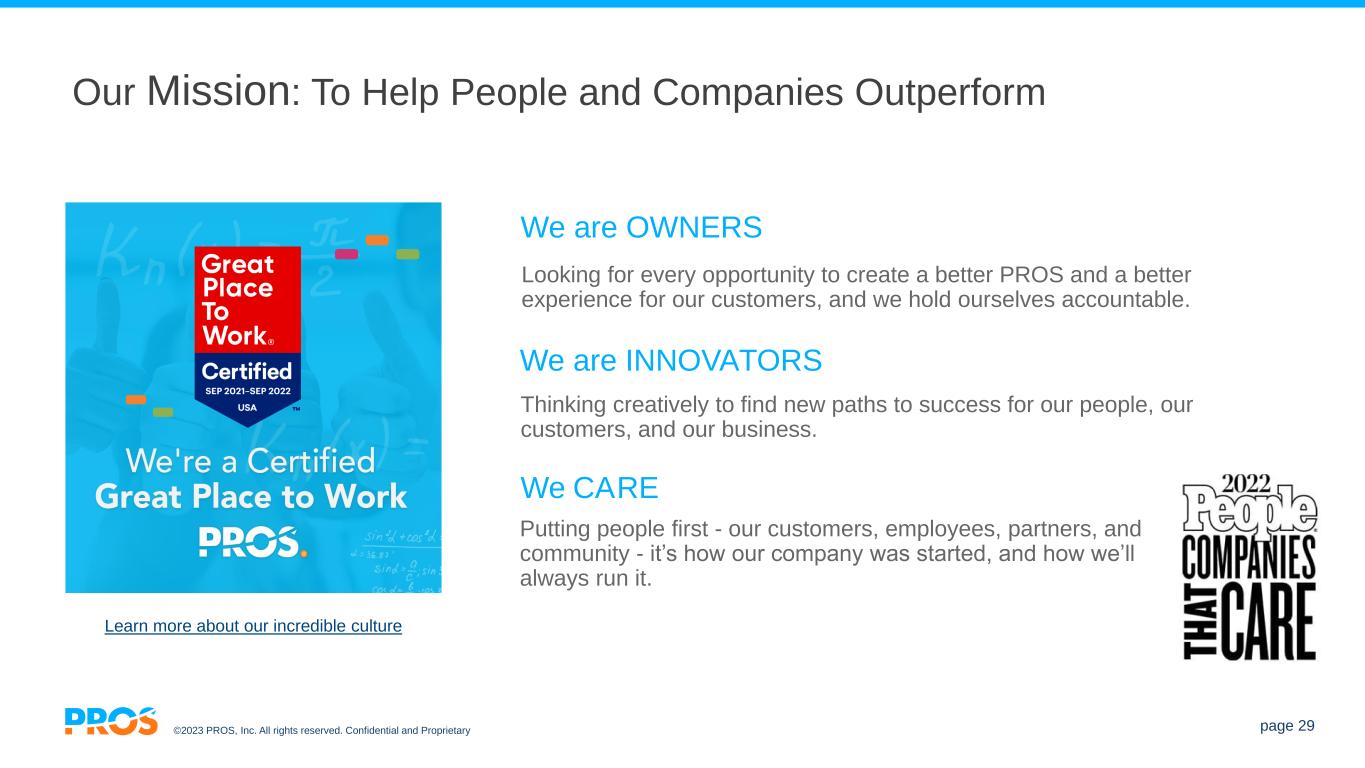 ©2023 PROS, Inc. All rights reserved. Confidential and Proprietary page 29 Our Mission: To Help People and Companies Outperform We are INNOVATORS Thinking creatively to find new paths to success for our people, our customers, and our business. We CARE Putting people first - our customers, employees, partners, and community - it’s how our company was started, and how we’ll always run it. Looking for every opportunity to create a better PROS and a better experience for our customers, and we hold ourselves accountable. We are OWNERS Learn more about our incredible culture