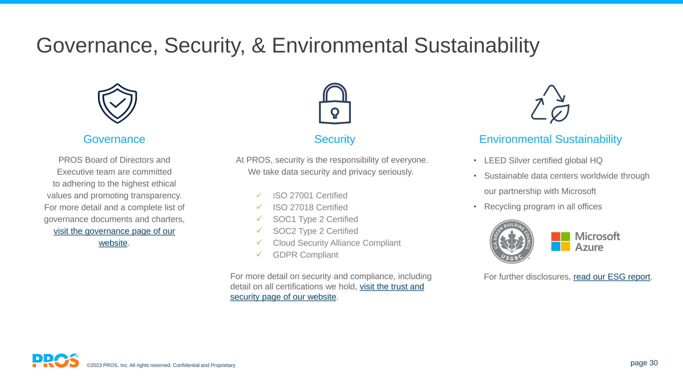 ©2023 PROS, Inc. All rights reserved. Confidential and Proprietary page 30 Governance, Security, & Environmental Sustainability Governance • LEED Silver certified global HQ • Sustainable data centers worldwide through our partnership with Microsoft • Recycling program in all offices Security PROS Board of Directors and Executive team are committed to adhering to the highest ethical values and promoting transparency. For more detail and a complete list of governance documents and charters, visit the governance page of our website. For further disclosures, read our ESG report. At PROS, security is the responsibility of everyone. We take data security and privacy seriously. ✓ ISO 27001 Certified ✓ ISO 27018 Certified ✓ SOC1 Type 2 Certified ✓ SOC2 Type 2 Certified ✓ Cloud Security Alliance Compliant ✓ GDPR Compliant For more detail on security and compliance, including detail on all certifications we hold, visit the trust and security page of our website. Environmental Sustainability
