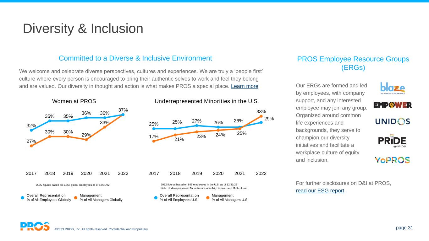 ©2023 PROS, Inc. All rights reserved. Confidential and Proprietary page 31 25% 25% 27% 26% 26% 29% 17% 21% 23% 24% 25% 33% 2017 2018 2019 2020 2021 2022 27% 30% 30% 29% 33% 37% 32% 35% 35% 36% 36% 2017 2018 2019 2020 2021 2022 Diversity & Inclusion PROS Employee Resource Groups (ERGs) Our ERGs are formed and led by employees, with company support, and any interested employee may join any group. Organized around common life experiences and backgrounds, they serve to champion our diversity initiatives and facilitate a workplace culture of equity and inclusion. Committed to a Diverse & Inclusive Environment We welcome and celebrate diverse perspectives, cultures and experiences. We are truly a ‘people first’ culture where every person is encouraged to bring their authentic selves to work and feel they belong and are valued. Our diversity in thought and action is what makes PROS a special place. Learn more Overall Representation % of All Employees Globally Management % of All Managers Globally Overall Representation % of All Employees U.S. Management % of All Managers U.S. Women at PROS Underrepresented Minorities in the U.S. 2022 figures based on 1,357 global employees as of 12/31/22 2022 figures based on 845 employees in the U.S. as of 12/31/22 Note: Underrepresented Minorities include AA, Hispanic and Multicultural For further disclosures on D&I at PROS, read our ESG report.