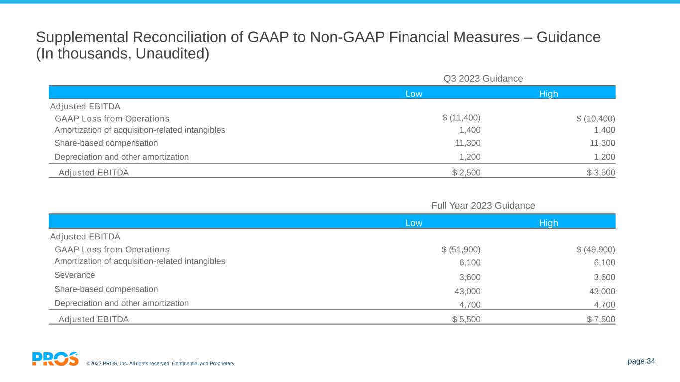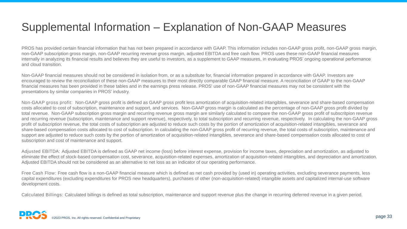 ©2023 PROS, Inc. All rights reserved. Confidential and Proprietary page 33 Supplemental Information – Explanation of Non-GAAP Measures PROS has provided certain financial information that has not been prepared in accordance with GAAP. This information includes non-GAAP gross profit, non-GAAP gross margin, non-GAAP subscription gross margin, non-GAAP recurring revenue gross margin, adjusted EBITDA and free cash flow. PROS uses these non-GAAP financial measures internally in analyzing its financial results and believes they are useful to investors, as a supplement to GAAP measures, in evaluating PROS’ ongoing operational performance and cloud transition. Non-GAAP financial measures should not be considered in isolation from, or as a substitute for, financial information prepared in accordance with GAAP. Investors are encouraged to review the reconciliation of these non-GAAP measures to their most directly comparable GAAP financial measure. A reconciliation of GAAP to the non-GAAP financial measures has been provided in these tables and in the earnings press release. PROS' use of non-GAAP financial measures may not be consistent with the presentations by similar companies in PROS' industry. Non-GAAP gross profit: Non-GAAP gross profit is defined as GAAP gross profit less amortization of acquisition-related intangibles, severance and share-based compensation costs allocated to cost of subscription, maintenance and support, and services. Non-GAAP gross margin is calculated as the percentage of non-GAAP gross profit divided by total revenue. Non-GAAP subscription gross margin and recurring revenue gross margin are similarly calculated to compare the non-GAAP gross profit of subscritpion revenue and recurring revenue (subscription, maintenance and support revenue), respectively, to total subscription and recurring revenue, respectively. In calculating the non-GAAP gross profit of subscription revenue, the total costs of subscription are adjusted to reduce such costs by the portion of amortization of acquisition-related intangibles, severance and share-based compensation costs allocated to cost of subscription. In calculating the non-GAAP gross profit of recurring revenue, the total costs of subscription, maintenance and support are adjusted to reduce such costs by the portion of amortization of acquisition-related intangibles, severance and share-based compensation costs allocated to cost of subscription and cost of maintenance and support. Adjusted EBITDA: Adjusted EBITDA is defined as GAAP net income (loss) before interest expense, provision for income taxes, depreciation and amortization, as adjusted to eliminate the effect of stock-based compensation cost, severance, acquisition-related expenses, amortization of acquisition-related intangibles, and depreciation and amortization. Adjusted EBITDA should not be considered as an alternative to net loss as an indicator of our operating performance. Free Cash Flow: Free cash flow is a non-GAAP financial measure which is defined as net cash provided by (used in) operating activities, excluding severance payments, less capital expenditures (excluding expenditures for PROS new headquarters), purchases of other (non-acquisition-related) intangible assets and capitalized internal-use software development costs. Calculated Billings: Calculated billings is defined as total subscription, maintenance and support revenue plus the change in recurring deferred revenue in a given period.