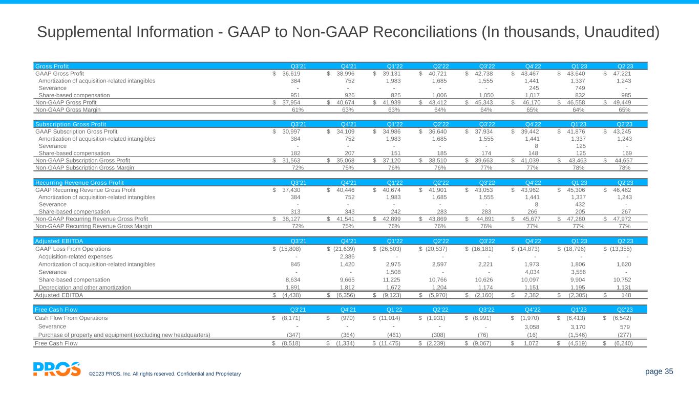 ©2023 PROS, Inc. All rights reserved. Confidential and Proprietary page 35 Supplemental Information - GAAP to Non-GAAP Reconciliations (In thousands, Unaudited) Gross Profit Q3'21 Q4'21 Q1'22 Q2'22 Q3'22 Q4'22 Q1'23 Q2'23 GAAP Gross Profit $ 36,619 $ 38,996 $ 39,131 $ 40,721 $ 42,738 $ 43,467 $ 43,640 $ 47,221 Amortization of acquisition-related intangibles 384 752 1,983 1,685 1,555 1,441 1,337 1,243 Severance - - - - - 245 749 - Share-based compensation 951 926 825 1,006 1,050 1,017 832 985 Non-GAAP Gross Profit $ 37,954 $ 40,674 $ 41,939 $ 43,412 $ 45,343 $ 46,170 $ 46,558 $ 49,449 Non-GAAP Gross Margin 61% 63% 63% 64% 64% 65% 64% 65% Subscription Gross Profit Q3'21 Q4'21 Q1'22 Q2'22 Q3'22 Q4'22 Q1'23 Q2'23 GAAP Subscription Gross Profit $ 30,997 $ 34,109 $ 34,986 $ 36,640 $ 37,934 $ 39,442 $ 41,876 $ 43,245 Amortization of acquisition-related intangibles 384 752 1,983 1,685 1,555 1,441 1,337 1,243 Severance - - - - - 8 125 - Share-based compensation 182 207 151 185 174 148 125 169 Non-GAAP Subscription Gross Profit $ 31,563 $ 35,068 $ 37,120 $ 38,510 $ 39,663 $ 41,039 $ 43,463 $ 44,657 Non-GAAP Subscription Gross Margin 72% 75% 76% 76% 77% 77% 78% 78% Recurring Revenue Gross Profit Q3'21 Q4'21 Q1'22 Q2'22 Q3'22 Q4'22 Q1'23 Q2'23 GAAP Recurring Revenue Gross Profit $ 37,430 $ 40,446 $ 40,674 $ 41,901 $ 43,053 $ 43,962 $ 45,306 $ 46,462 Amortization of acquisition-related intangibles 384 752 1,983 1,685 1,555 1,441 1,337 1,243 Severance - - - - - 8 432 - Share-based compensation 313 343 242 283 283 266 205 267 Non-GAAP Recurring Revenue Gross Profit $ 38,127 $ 41,541 $ 42,899 $ 43,869 $ 44,891 $ 45,677 $ 47,280 $ 47,972 Non-GAAP Recurring Revenue Gross Margin 72% 75% 76% 76% 76% 77% 77% 77% Adjusted EBITDA Q3'21 Q4'21 Q1'22 Q2'22 Q3'22 Q4'22 Q1'23 Q2'23 GAAP Loss From Operations $ (15,808) $ (21,639) $ (26,503) $ (20,537) $ (16,181) $ (14,873) $ (18,796) $ (13,355) Acquisition-related expenses - 2,386 - - - - - - Amortization of acquisition-related intangibles 845 1,420 2,975 2,597 2,221 1,973 1,806 1,620 Severance - - 1,508 - - 4,034 3,586 - Share-based compensation 8,634 9,665 11,225 10,766 10,626 10,097 9,904 10,752 Depreciation and other amortization 1,891 1,812 1,672 1,204 1,174 1,151 1,195 1,131 Adjusted EBITDA $ (4,438) $ (6,356) $ (9,123) $ (5,970) $ (2,160) $ 2,382 $ (2,305) $ 148 Free Cash Flow Q3'21 Q4'21 Q1'22 Q2'22 Q3'22 Q4'22 Q1'23 Q2'23 Cash Flow From Operations $ (8,171) $ (970) $ (11,014) $ (1,931) $ (8,991) $ (1,970) $ (6,413) $ (6,542) Severance - - - - - 3,058 3,170 579 Purchase of property and equipment (excluding new headquarters) (347) (364) (461) (308) (76) (16) (1,546) (277) Free Cash Flow $ (8,518) $ (1,334) $ (11,475) $ (2,239) $ (9,067) $ 1,072 $ (4,519) $ (6,240)