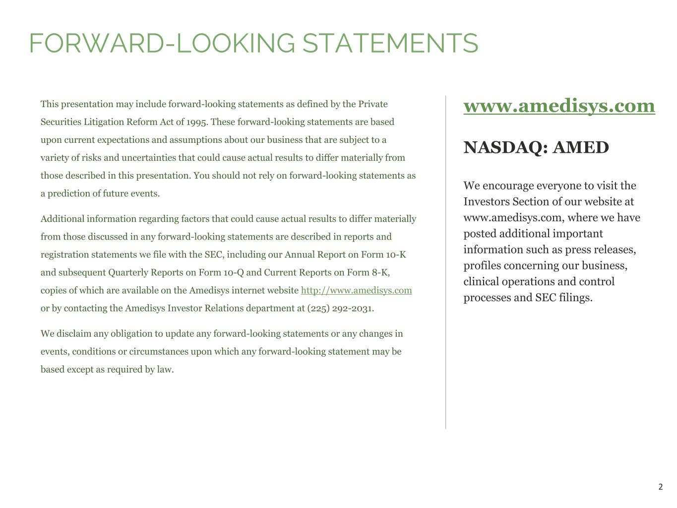 2 This presentation may include forward-looking statements as defined by the Private Securities Litigation Reform Act of 1995. These forward-looking statements are based upon current expectations and assumptions about our business that are subject to a variety of risks and uncertainties that could cause actual results to differ materially from those described in this presentation. You should not rely on forward-looking statements as a prediction of future events. Additional information regarding factors that could cause actual results to differ materially from those discussed in any forward-looking statements are described in reports and registration statements we file with the SEC, including our Annual Report on Form 10-K and subsequent Quarterly Reports on Form 10-Q and Current Reports on Form 8-K, copies of which are available on the Amedisys internet website http://www.amedisys.com or by contacting the Amedisys Investor Relations department at (225) 292-2031. We disclaim any obligation to update any forward-looking statements or any changes in events, conditions or circumstances upon which any forward-looking statement may be based except as required by law. www.amedisys.com NASDAQ: AMED We encourage everyone to visit the Investors Section of our website at www.amedisys.com, where we have posted additional important information such as press releases, profiles concerning our business, clinical operations and control processes and SEC filings. FORWARD-LOOKING STATEMENTS