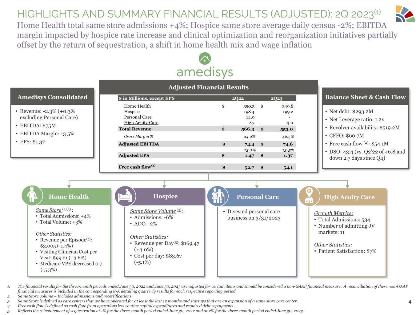 3 OUR KEY AREAS OF FOCUS Strategic areas of focus and progress made during Q2’23 • Home Health*: Total same store admissions +4% • Hospice: Total same store admissions -6%, ADC -2% • High Acuity Care: Admissions +55% over prior year 1 Organic Growth • Quality: Amedisys Oct’23 preview STARS score of 4.44 • 99% of care centers at 4+ Stars based on Oct’23 preview • 42 Amedisys care centers rated at 5 Stars in the Oct’23 preview • Hospice quality – outperforming industry average in all hospice item set (HIS) categories 3 Clinical Initiatives • Focusing on optimizing RN / LPN & PT / PTA staffing ratios. • Current LPN Ratio: 48.2% (vs. 47.7% in 2Q’22) • Current PTA Ratio: 54.2% (vs. 53.4% in 2Q’22) 4 Capacity and Productivity • Pending merger with UnitedHealth Group Inc. 5 M&A 2 Recruiting / Retention • Targeting industry leading employee retention amongst all employee categories • Q2’23 Voluntary Turnover 18.8% *Note: Home Health same store volume is defined as admissions plus recertifications 2023 Reimbursement • Final Hospice industry rule – Amedisys impact +3.8% increase (effective 10/1/22) • Final Home Health industry rule – Amedisys impact flat (effective 1/1/23) 2024 Reimbursement • Proposed Hospice industry rule – Amedisys estimated impact +2.8% increase (effective 10/1/23) • Proposed Home Health industry rule – industry estimated impact -2.2% decrease (effective 1/1/24) 6 Regulatory