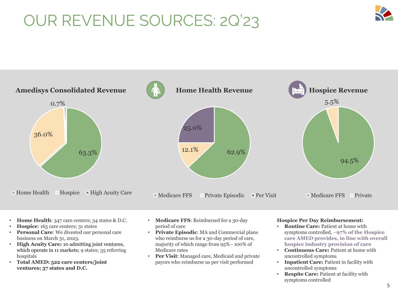 4 HIGHLIGHTS AND SUMMARY FINANCIAL RESULTS (ADJUSTED): 2Q 2023(1) Home Health total same store admissions +4%; Hospice same store average daily census -2%; EBITDA margin impacted by hospice rate increase and clinical optimization and reorganization initiatives partially offset by the return of sequestration, a shift in home health mix and wage inflation 1. The financial results for the three-month periods ended June 30, 2022 and June 30, 2023 are adjusted for certain items and should be considered a non-GAAP financial measure. A reconciliation of these non-GAAP financial measures is included in the corresponding 8-K detailing quarterly results for each respective reporting period. 2. Same Store volume – Includes admissions and recertifications. 3. Same Store is defined as care centers that we have operated for at least the last 12 months and startups that are an expansion of a same store care center. 4. Free cash flow is defined as cash flow from operations less routine capital expenditures and required debt repayments. 5. Reflects the reinstatement of sequestration at 1% for the three-month period ended June 30, 2022 and at 2% for the three-month period ended June 30, 2023. Growth Metrics: • Total Admissions: 534 • Number of admitting JV markets: 11 Other Statistics: • Patient Satisfaction: 87% High Acuity Care Adjusted Financial Results • Divested personal care business on 3/31/2023 Personal Care Same Store Volume (3): • Admissions: -6% • ADC: -2% Other Statistics: • Revenue per Day(5): $169.47 (+3.0%) • Cost per day: $83.67 (-5.1%) HospiceHome Health Same Store (2)(3) : • Total Admissions: +4% • Total Volume: +3% Other Statistics: • Revenue per Episode(5): $3,005 (-1.4%) • Visiting Clinician Cost per Visit: $99.21 (+3.6%) • Medicare VPE decreased 0.7 (-5.3%) Amedisys Consolidated • Revenue: -2.3% (+0.3% excluding Personal Care) • EBITDA: $75M • EBITDA Margin: 13.5% • EPS: $1.37 Amedisys Consolidated Amedisys Consolidated Balance Sheet & Cash Flow • Net debt: $293.2M • Net Leverage ratio: 1.2x • Revolver availability: $519.2M • CFFO: $60.7M • Free cash flow (4): $54.1M • DSO: 43.4 (vs. Q2’22 of 46.8 and down 2.7 days since Q4) $ in Millions, except EPS 2Q22 2Q23 Home Health 350.3$ 349.8$ Hospice 198.4 199.2 Personal Care 14.9 - High Acuity Care 2.7 4.0 Total Revenue 566.3$ 553.0$ Gross Margin % 44.9% 46.5% Adjusted EBITDA 74.4$ 74.6$ 13.1% 13.5% Adjusted EPS 1.47$ 1.37$ Free cash flow(4) 52.7$ 54.1$