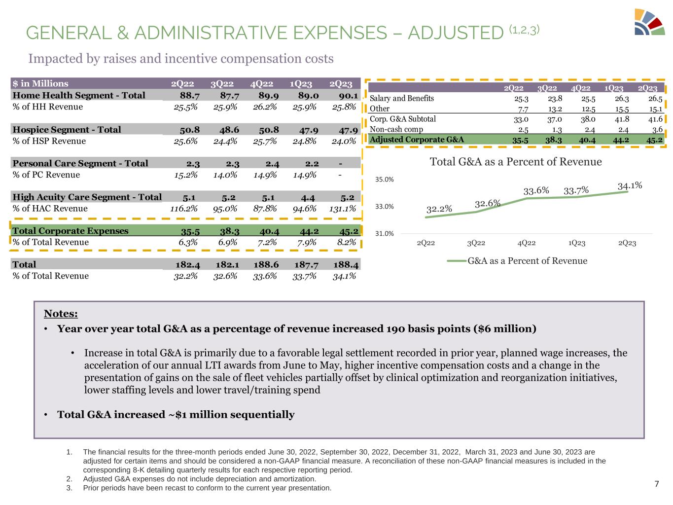 6 HOME HEALTH AND HOSPICE SEGMENT (ADJUSTED) – Q2 2023(1) • Revenue per Episode down 1.4% due to the reinstatement of sequestration at 2% (vs 1% in 2Q’22). Reimbursement is flat year over year. • Y/Y Total CPV up $3.83 (+3.6%) primarily due to raises, wage inflation, an increase in new hire pay, higher contractor costs (COVID-related rate increases are no longer classified as an adjusting item) and visit mix. • Cost per episode down 1.9% (Medicare) Home Health Highlights • Net revenue per day +3.0%; +3.8% Hospice rate update effective 10/1/2022 was offset by the reinstatement of sequestration at 2% (vs 1% in 2Q’22). • Total ADC impacted by 2022 care center closures (120 ADC impact) • Cost per day down $4.54 (-5.1%) primarily due to clinical optimization and reorganization initiatives and a new pharmacy contract partially offset by planned wage increases. Hospice Highlights 1. The financial results for the three-month periods ended June 30, 2022 and June 30, 2023 are adjusted for certain items and should be considered a non-GAAP financial measure. A reconciliation of these non- GAAP financial measures is included in the corresponding 8-K detailing quarterly results for each respective reporting period. 2. Pre-Corporate EBITDA does not include any corporate G&A expenses. 3. Same Store information represents the percent change in volume, admissions or ADC for the period as a percent of the volume, admissions or ADC of the prior period. 4. Same Store is defined as care centers that we have operated for at least the last 12 months and startups that are an expansion of a same store care center. 5. Reflects the reinstatement of sequestration at 1% for the three-month period ended June 30, 2022 and at 2% for the three-month period ended June 30, 2023. 6. Prior year amounts have been recast to conform to the current year presentation. $ in Millions 2Q22(6) 2Q23 Medicare 230.4$ 219.8$ Non-Medicare 119.9 130.0 Home Health Revenue $350.3 $349.8 Gross Margin % 45.4% 44.7% Pre-Corporate EBITDA(2) $70.7 $66.7 20.2% 19.1% Operating Statistics Same Store Growth(3)(4) Total admissions 0% 4% Total volume -2% 3% Medicare revenue per episode(5) $3,048 $3,005 Medicare recert rate 33.6% 33.0% Total cost per visit $106.52 $110.35 HOME HEALTH $ in Millions 2Q22 2Q23 Medicare 187.5$ 188.2$ Non-Medicare 10.9 11.0 Hospice Revenue $198.4 $199.2 Gross Margin % 46.4% 50.6% Pre-Corporate EBITDA(2) $41.8 $53.5 21.1% 26.8% Operating Statistics Admit growth - same store(3)(4) 6% -6% ADC growth - same store(3)(4) 0% -2% ADC 13,249 12,918 Avg. discharge length of stay 87 90 Revenue per day (net)(5) $164.55 $169.47 Cost per day $88.21 $83.67 HOSPICE