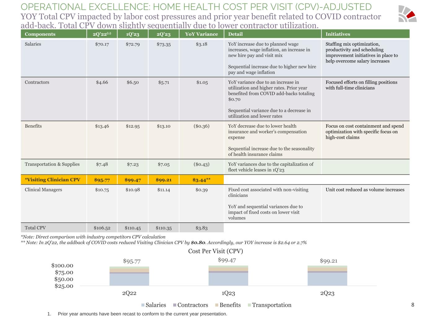 7 $ in Millions 2Q22 3Q22 4Q22 1Q23 2Q23 Home Health Segment - Total 88.7 87.7 89.9 89.0 90.1 % of HH Revenue 25.5% 25.9% 26.2% 25.9% 25.8% Hospice Segment - Total 50.8 48.6 50.8 47.9 47.9 % of HSP Revenue 25.6% 24.4% 25.7% 24.8% 24.0% Personal Care Segment - Total 2.3 2.3 2.4 2.2 - % of PC Revenue 15.2% 14.0% 14.9% 14.9% - High Acuity Care Segment - Total 5.1 5.2 5.1 4.4 5.2 % of HAC Revenue 116.2% 95.0% 87.8% 94.6% 131.1% Total Corporate Expenses 35.5 38.3 40.4 44.2 45.2 % of Total Revenue 6.3% 6.9% 7.2% 7.9% 8.2% Total 182.4 182.1 188.6 187.7 188.4 % of Total Revenue 32.2% 32.6% 33.6% 33.7% 34.1% GENERAL & ADMINISTRATIVE EXPENSES – ADJUSTED (1,2,3) Notes: • Year over year total G&A as a percentage of revenue increased 190 basis points ($6 million) • Increase in total G&A is primarily due to a favorable legal settlement recorded in prior year, planned wage increases, the acceleration of our annual LTI awards from June to May, higher incentive compensation costs and a change in the presentation of gains on the sale of fleet vehicles partially offset by clinical optimization and reorganization initiatives, lower staffing levels and lower travel/training spend • Total G&A increased ~$1 million sequentially 1. The financial results for the three-month periods ended June 30, 2022, September 30, 2022, December 31, 2022, March 31, 2023 and June 30, 2023 are adjusted for certain items and should be considered a non-GAAP financial measure. A reconciliation of these non-GAAP financial measures is included in the corresponding 8-K detailing quarterly results for each respective reporting period. 2. Adjusted G&A expenses do not include depreciation and amortization. 3. Prior periods have been recast to conform to the current year presentation. Impacted by raises and incentive compensation costs 32.2% 32.6% 33.6% 33.7% 34.1% 31.0% 33.0% 35.0% 2Q22 3Q22 4Q22 1Q23 2Q23 Total G&A as a Percent of Revenue G&A as a Percent of Revenue 2Q22 3Q22 4Q22 1Q23 2Q23 Salary and Benefits 25.3 23.8 25.5 26.3 26.5 Other 7.7 13.2 12.5 15.5 15.1 Corp. G&A Subtotal 33.0 37.0 38.0 41.8 41.6 Non-cash comp 2.5 1.3 2.4 2.4 3.6 Adjusted Corporate G&A 35.5 38.3 40.4 44.2 45.2