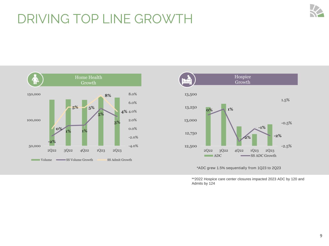 8 OPERATIONAL EXCELLENCE: HOME HEALTH COST PER VISIT (CPV)-ADJUSTED YOY Total CPV impacted by labor cost pressures and prior year benefit related to COVID contractor add-back. Total CPV down slightly sequentially due to lower contractor utilization. *Note: Direct comparison with industry competitors CPV calculation ** Note: In 2Q’22, the addback of COVID costs reduced Visiting Clinician CPV by $0.80. Accordingly, our YOY increase is $2.64 or 2.7% $25.00 $50.00 $75.00 $100.00 2Q22 1Q23 2Q23 Cost Per Visit (CPV) Salaries Contractors Benefits Transportation $95.77 $99.47 $99.21 Components 2Q’22(1) 1Q’23 2Q’23 YoY Variance Detail Initiatives Salaries $70.17 $72.79 $73.35 $3.18 YoY increase due to planned wage increases, wage inflation, an increase in new hire pay and visit mix Sequential increase due to higher new hire pay and wage inflation Staffing mix optimization, productivity and scheduling improvement initiatives in place to help overcome salary increases Contractors $4.66 $6.50 $5.71 $1.05 YoY variance due to an increase in utilization and higher rates. Prior year benefited from COVID add-backs totaling $0.70 Sequential variance due to a decrease in utilization and lower rates Focused efforts on filling positions with full-time clinicians Benefits $13.46 $12.95 $13.10 ($0.36) YoY decrease due to lower health insurance and worker’s compensation expense Sequential increase due to the seasonality of health insurance claims Focus on cost containment and spend optimization with specific focus on high-cost claims Transportation & Supplies $7.48 $7.23 $7.05 ($0.43) YoY variances due to the capitalization of fleet vehicle leases in 1Q’23 *Visiting Clinician CPV $95.77 $99.47 $99.21 $3.44** Clinical Managers $10.75 $10.98 $11.14 $0.39 Fixed cost associated with non-visiting clinicians YoY and sequential variances due to impact of fixed costs on lower visit volumes Unit cost reduced as volume increases Total CPV $106.52 $110.45 $110.35 $3.83 1. Prior year amounts have been recast to conform to the current year presentation.