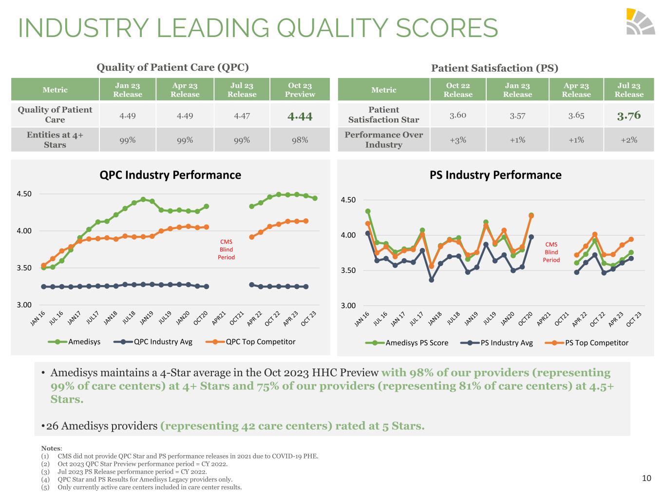 9 DRIVING TOP LINE GROWTH -2% 1% 1% 5% 3% 0% 5% 5% 8% 4% -4.0% -2.0% 0.0% 2.0% 4.0% 6.0% 8.0% 50,000 100,000 150,000 2Q22 3Q22 4Q22 1Q23 2Q23 Volume SS Volume Growth SS Admit Growth Home Health Growth Hospice Growth 0% 1% -2% -1% -2% -2.5% -0.5% 1.5% 12,500 12,750 13,000 13,250 13,500 2Q22 3Q22 4Q22 1Q23 2Q23 ADC SS ADC Growth **2022 Hospice care center closures impacted 2023 ADC by 120 and Admits by 124 *ADC grew 1.5% sequentially from 1Q23 to 2Q23