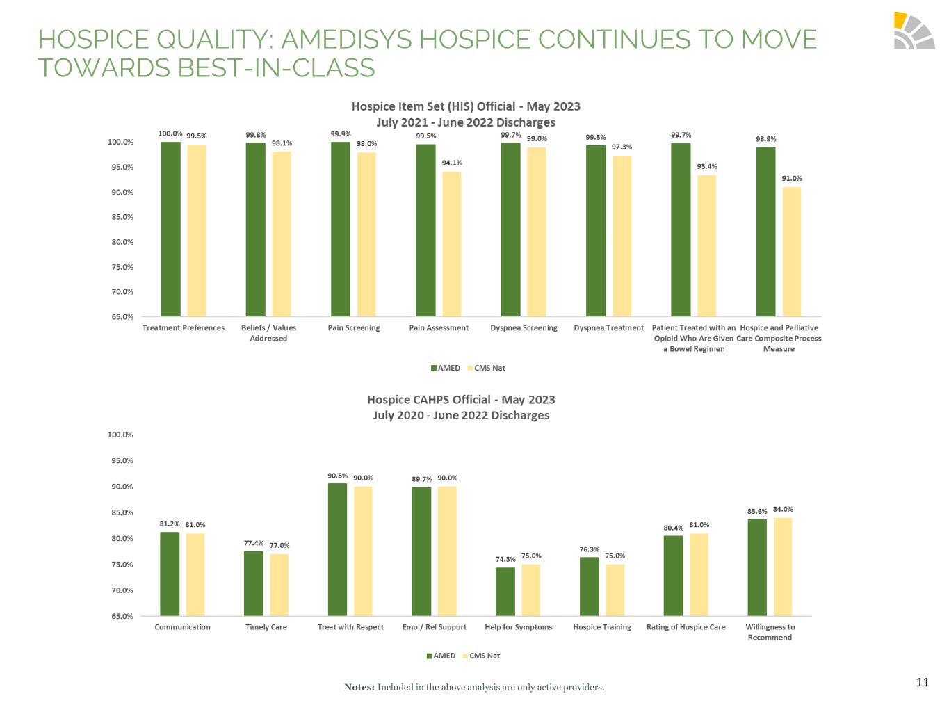 10 INDUSTRY LEADING QUALITY SCORES Quality of Patient Care (QPC) Patient Satisfaction (PS) • Amedisys maintains a 4-Star average in the Oct 2023 HHC Preview with 98% of our providers (representing 99% of care centers) at 4+ Stars and 75% of our providers (representing 81% of care centers) at 4.5+ Stars. •26 Amedisys providers (representing 42 care centers) rated at 5 Stars. Notes: (1) CMS did not provide QPC Star and PS performance releases in 2021 due to COVID-19 PHE. (2) Oct 2023 QPC Star Preview performance period = CY 2022. (3) Jul 2023 PS Release performance period = CY 2022. (4) QPC Star and PS Results for Amedisys Legacy providers only. (5) Only currently active care centers included in care center results. CMS Blind Period Metric Jan 23 Release Apr 23 Release Jul 23 Release Oct 23 Preview Quality of Patient Care 4.49 4.49 4.47 4.44 Entities at 4+ Stars 99% 99% 99% 98% 3.00 3.50 4.00 4.50 QPC Industry Performance Amedisys QPC Industry Avg QPC Top Competitor CMS Blind Period Metric Oct 22 Release Jan 23 Release Apr 23 Release Jul 23 Release Patient Satisfaction Star 3.60 3.57 3.65 3.76 Performance Over Industry +3% +1% +1% +2% 3.00 3.50 4.00 4.50 PS Industry Performance Amedisys PS Score PS Industry Avg PS Top Competitor CMS Blind Period