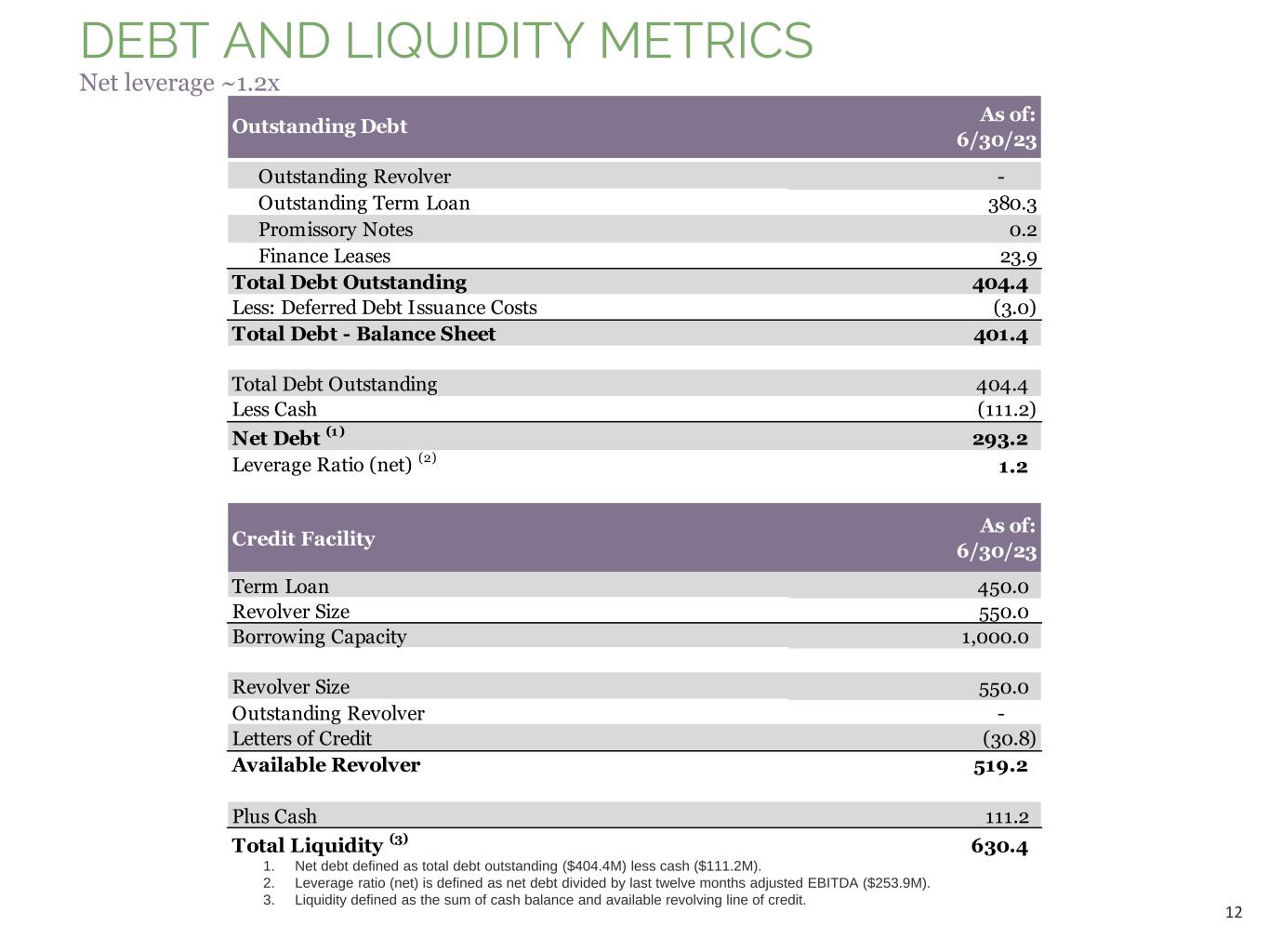 12 DEBT AND LIQUIDITY METRICS Net leverage ~1.2x 1. Net debt defined as total debt outstanding ($404.4M) less cash ($111.2M). 2. Leverage ratio (net) is defined as net debt divided by last twelve months adjusted EBITDA ($253.9M). 3. Liquidity defined as the sum of cash balance and available revolving line of credit. Outstanding Revolver - Outstanding Term Loan 380.3 Promissory Notes 0.2 Finance Leases 23.9 Total Debt Outstanding 404.4 Less: Deferred Debt Issuance Costs (3.0) Total Debt - Balance Sheet 401.4 Total Debt Outstanding 404.4 Less Cash (111.2) Net Debt (1) 293.2 Leverage Ratio (net) (2) 1.2 Term Loan 450.0 Revolver Size 550.0 Borrowing Capacity 1,000.0 Revolver Size 550.0 Outstanding Revolver - Letters of Credit (30.8) Available Revolver 519.2 Plus Cash 111.2 Total Liquidity (3) 630.4 As of: 6/30/23 Credit Facility Outstanding Debt As of: 6/30/23