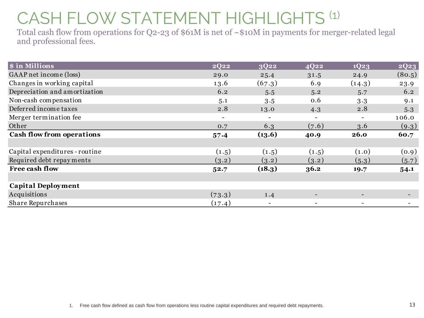 13 CASH FLOW STATEMENT HIGHLIGHTS (1) Total cash flow from operations for Q2-23 of $61M is net of ~$10M in payments for merger-related legal and professional fees. 1. Free cash flow defined as cash flow from operations less routine capital expenditures and required debt repayments. $ in Millions 2Q22 3Q22 4Q22 1Q23 2Q23 GAAP net income (loss) 29.0 25.4 31 .5 24.9 (80.5) Changes in working capital 1 3 .6 (67 .3) 6.9 (1 4.3) 23 .9 Depreciation and amortization 6.2 5.5 5.2 5.7 6.2 Non-cash compensation 5.1 3 .5 0.6 3 .3 9.1 Deferred income taxes 2.8 1 3 .0 4.3 2 .8 5.3 Merger termination fee - - - - 1 06.0 Other 0.7 6.3 (7 .6) 3 .6 (9.3) Cash flow from operations 57.4 (13.6) 40.9 26.0 60.7 Capital expenditures - routine (1 .5) (1 .5) (1 .5) (1 .0) (0.9) Required debt repay ments (3.2) (3 .2) (3 .2) (5.3) (5.7 ) Free cash flow 52.7 (18.3) 36.2 19.7 54.1 Capital Deployment Acquisitions (7 3.3) 1 .4 - - - Share Repurchases (1 7 .4) - - - -