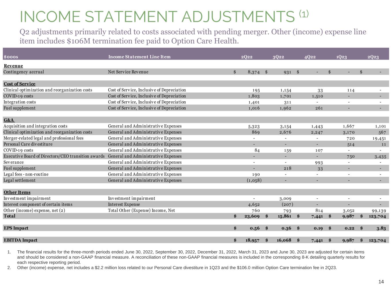14 INCOME STATEMENT ADJUSTMENTS (1) 1. The financial results for the three-month periods ended June 30, 2022, September 30, 2022, December 31, 2022, March 31, 2023 and June 30, 2023 are adjusted for certain items and should be considered a non-GAAP financial measure. A reconciliation of these non-GAAP financial measures is included in the corresponding 8-K detailing quarterly results for each respective reporting period. 2. Other (income) expense, net includes a $2.2 million loss related to our Personal Care divestiture in 1Q23 and the $106.0 million Option Care termination fee in 2Q23. Q2 adjustments primarily related to costs associated with pending merger. Other (income) expense line item includes $106M termination fee paid to Option Care Health. $000s Income Statement Line Item 2Q22 3Q22 4Q22 1Q23 2Q23 Revenue Contingency accrual Net Serv ice Rev enue 8,37 4$ 931$ -$ -$ -$ Cost of Service Clinical optimization and reorganization costs Cost of Serv ice, Inclusiv e of Depreciation 1 95 1 ,1 54 33 1 1 4 - COVID-1 9 costs Cost of Serv ice, Inclusiv e of Depreciation 1 ,803 1 ,7 01 1 ,51 0 - - Integration costs Cost of Serv ice, Inclusiv e of Depreciation 1 ,401 31 1 - - - Fuel supplement Cost of Serv ice, Inclusiv e of Depreciation 1 ,01 6 1 ,962 261 - - G&A Acquisition and integration costs General and Administrativ e Expenses 5,323 3,1 54 1 ,443 1 ,667 1 ,1 01 Clinical optimization and reorganization costs General and Administrativ e Expenses 869 2 ,67 6 2 ,247 3 ,1 7 0 567 Merger-related legal and professional fees General and Administrativ e Expenses - - - 7 20 1 9,451 Personal Care div estiture General and Administrativ e Expenses - - - 51 4 1 1 COVID-1 9 costs General and Administrativ e Expenses 84 1 59 1 07 - - Executiv e Board of Directors/CEO transition awards General and Administrativ e Expenses - - - 7 50 3 ,435 Sev erance General and Administrativ e Expenses - - 993 - - Fuel supplement General and Administrativ e Expenses - 21 8 33 - - Legal fees - non-routine General and Administrativ e Expenses 1 90 - - - - Legal settlement General and Administrativ e Expenses (1 ,058) - - - - Other Items Inv estment impairment Inv estment impairment - 3 ,009 - - - Interest component of certain items Interest Expense 4,652 (207 ) - - - Other (income) expense, net (2) Total Other (Expense) Income, Net 7 60 7 93 81 4 3 ,052 99,1 39 Total 23,609$ 15,861$ 7 ,441$ 9,987$ 123,704$ EPS Impact 0.56$ 0.36$ 0.19$ 0.22$ 3.83$ EBITDA Impact 18,957$ 16,068$ 7 ,441$ 9,987$ 123,704$