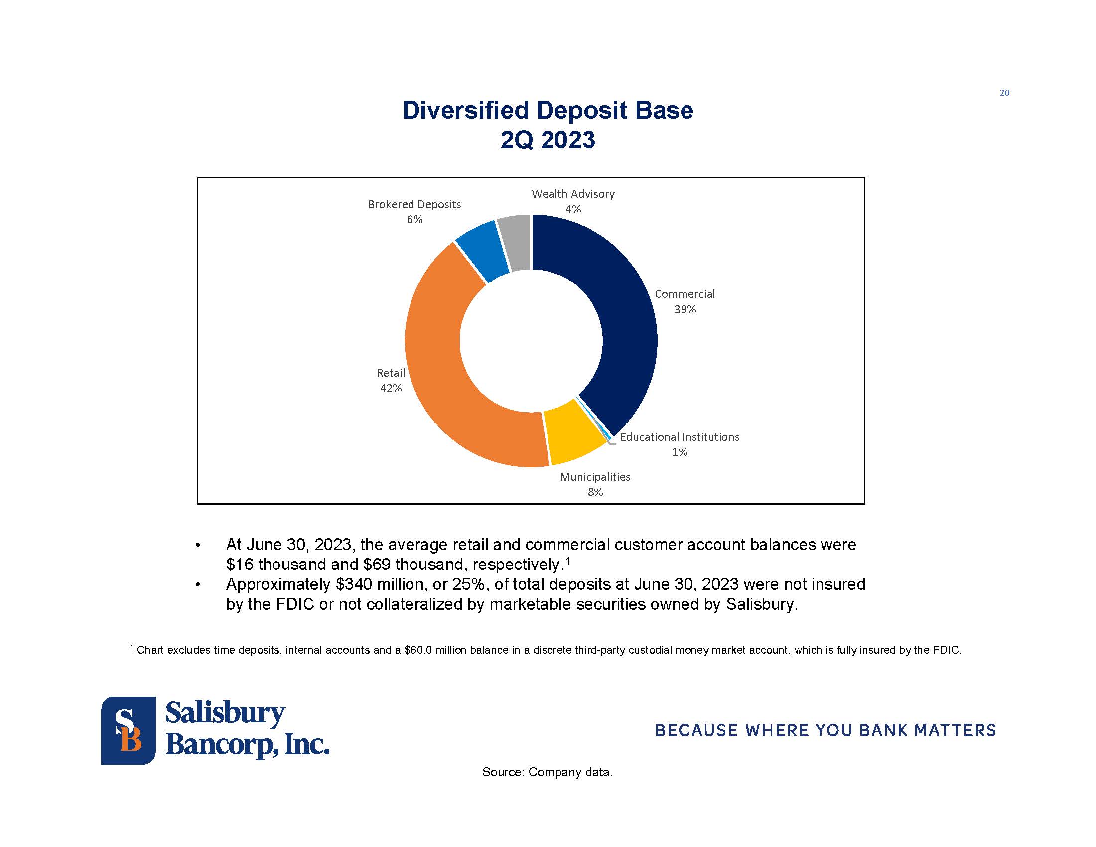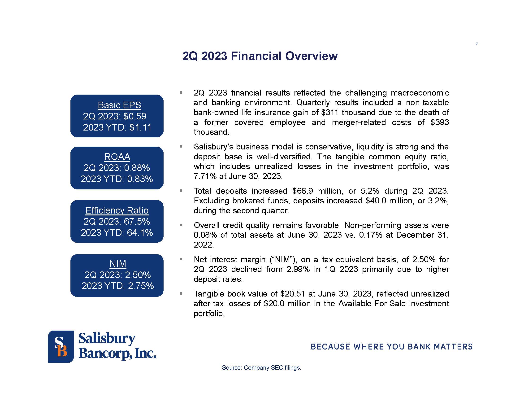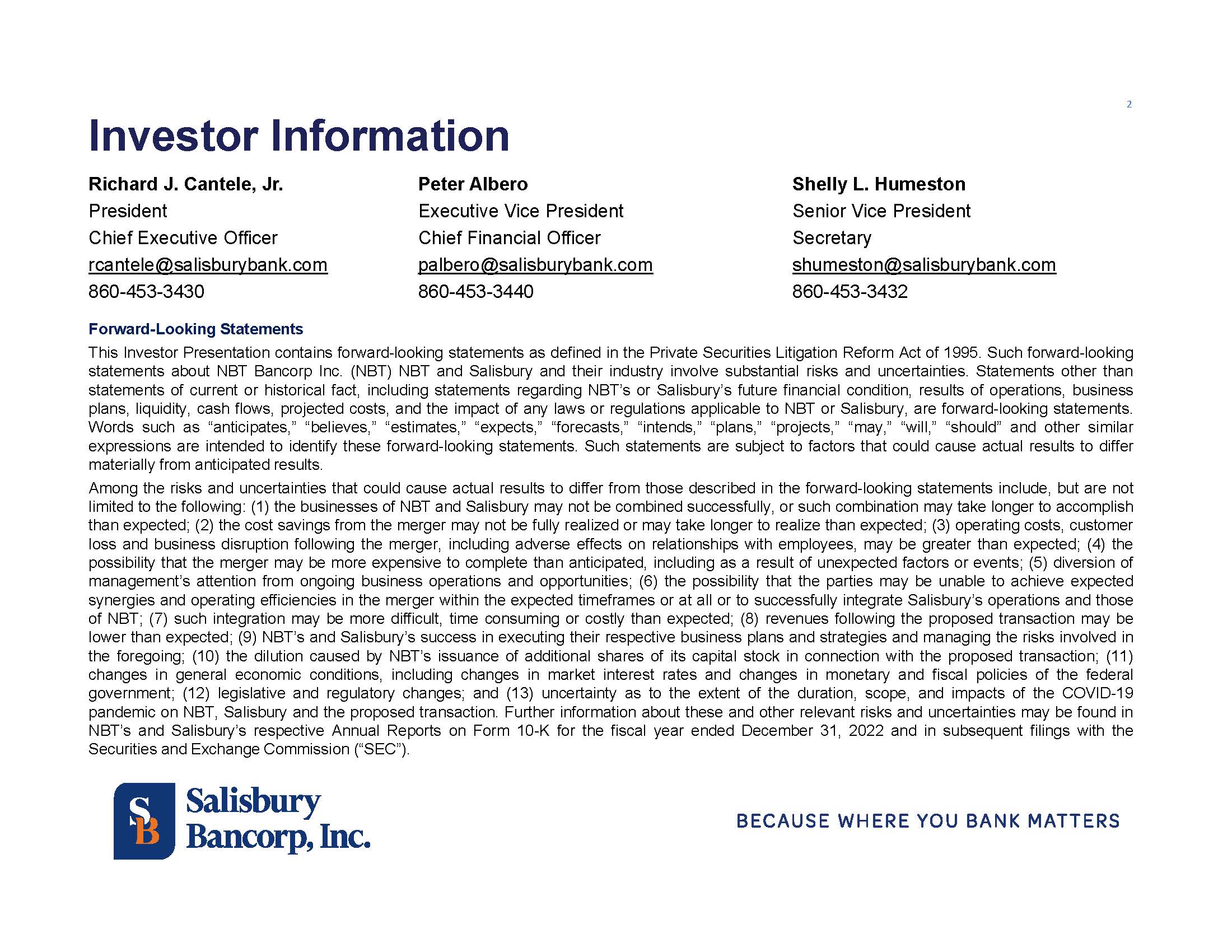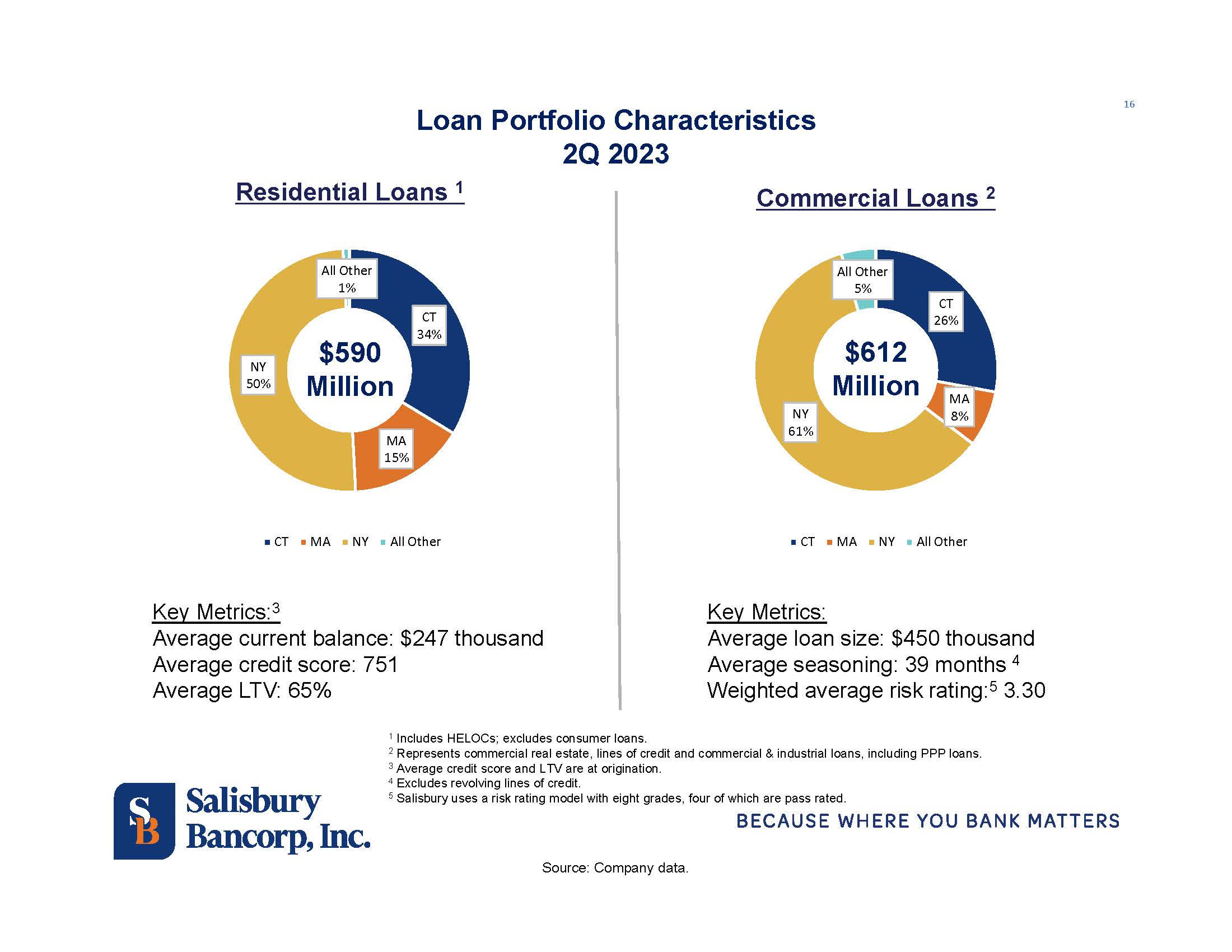 Salisbury’s President and Chief Executive Officer, Richard J. Cantele, Jr., stated, “Our results for the second quarter reflected the challenging macroeconomic and banking environment. While deposit balances increased during the quarter, and the credit quality of our loan portfolio remained strong, higher interest rates compressed net interest margin and earnings. Although the operating environment is likely to remain challenging in the near term, we are excited to have received regulatory approval for our strategic merger into NBT Bancorp. We believe Salisbury shareholders will benefit from the additional scale and expanded suite of products and services offered by NBT. I am extremely proud of the employees of Salisbury Bank who have worked diligently over the years to provide outstanding service to our customers and to give back to our communities. I am also grateful to our many customers for allowing us to partner and grow with them. I am confident that our customers will experience the same level of service from NBT.”