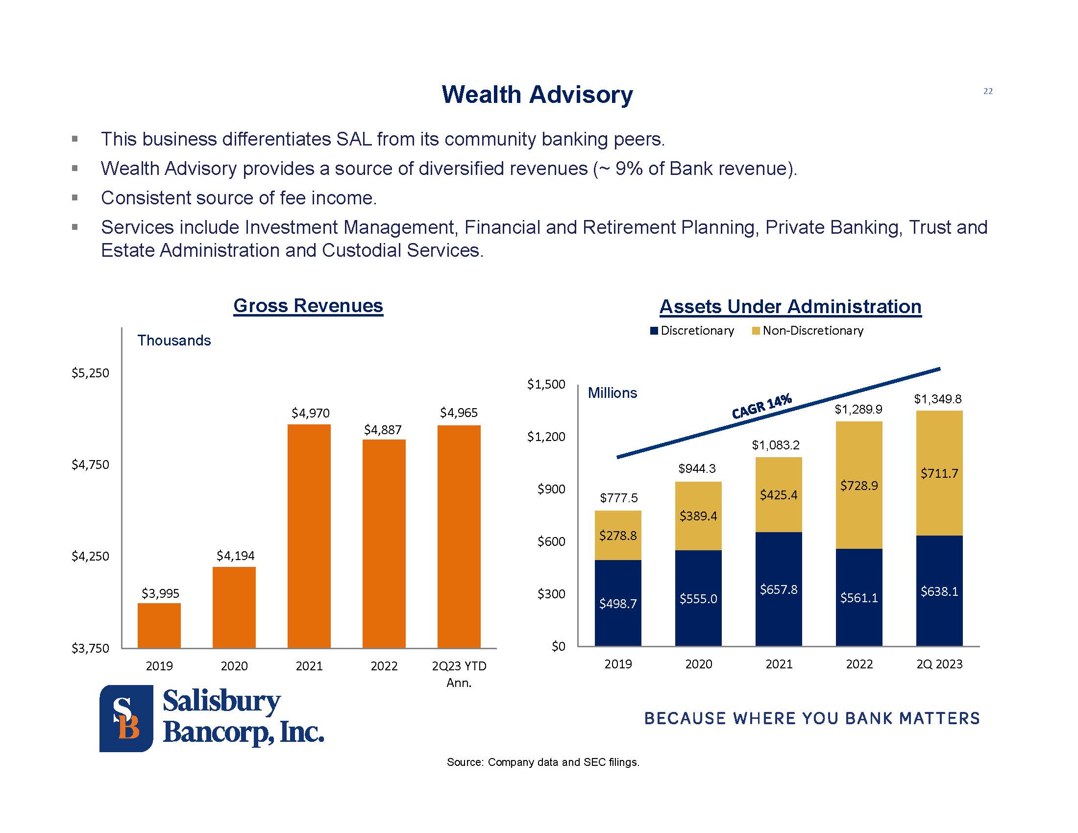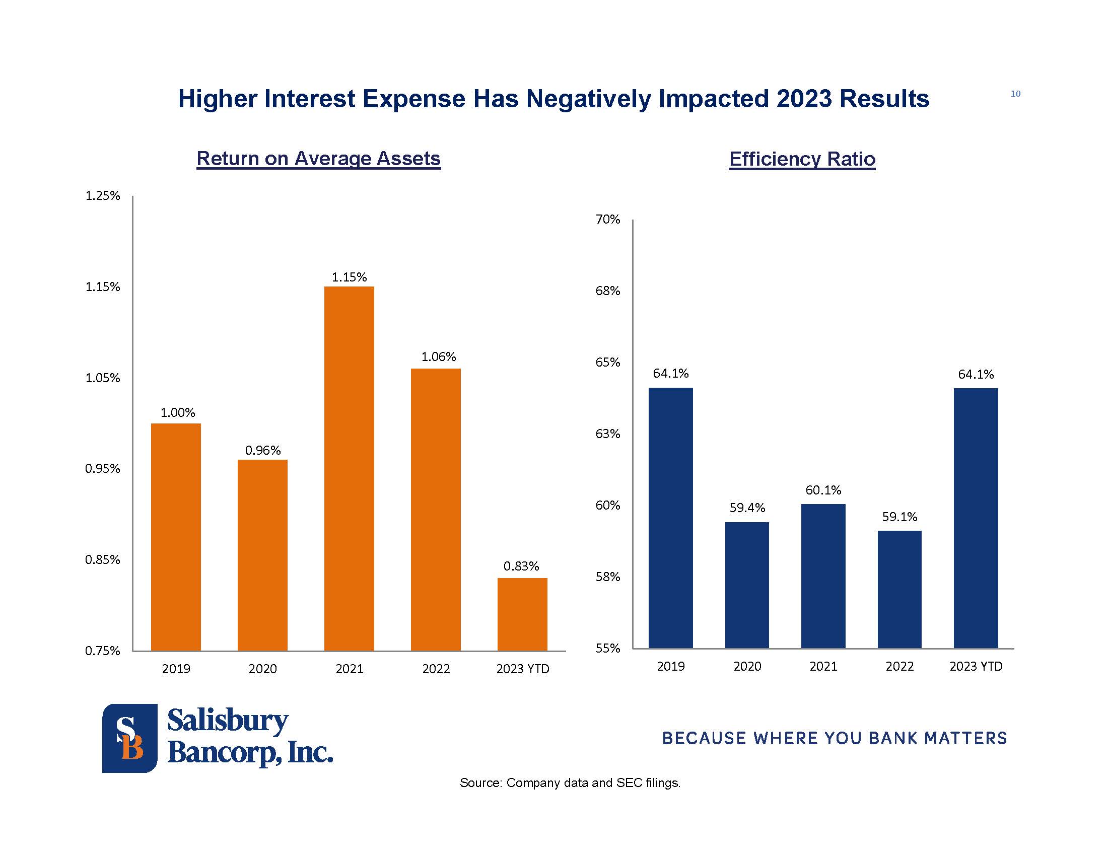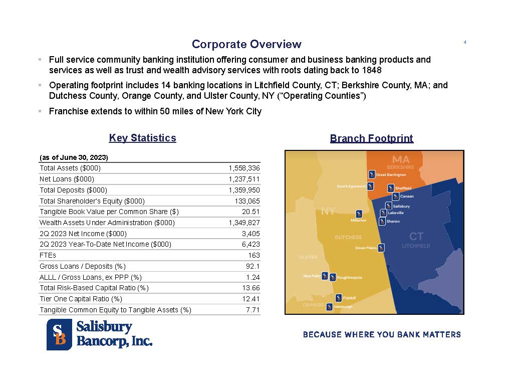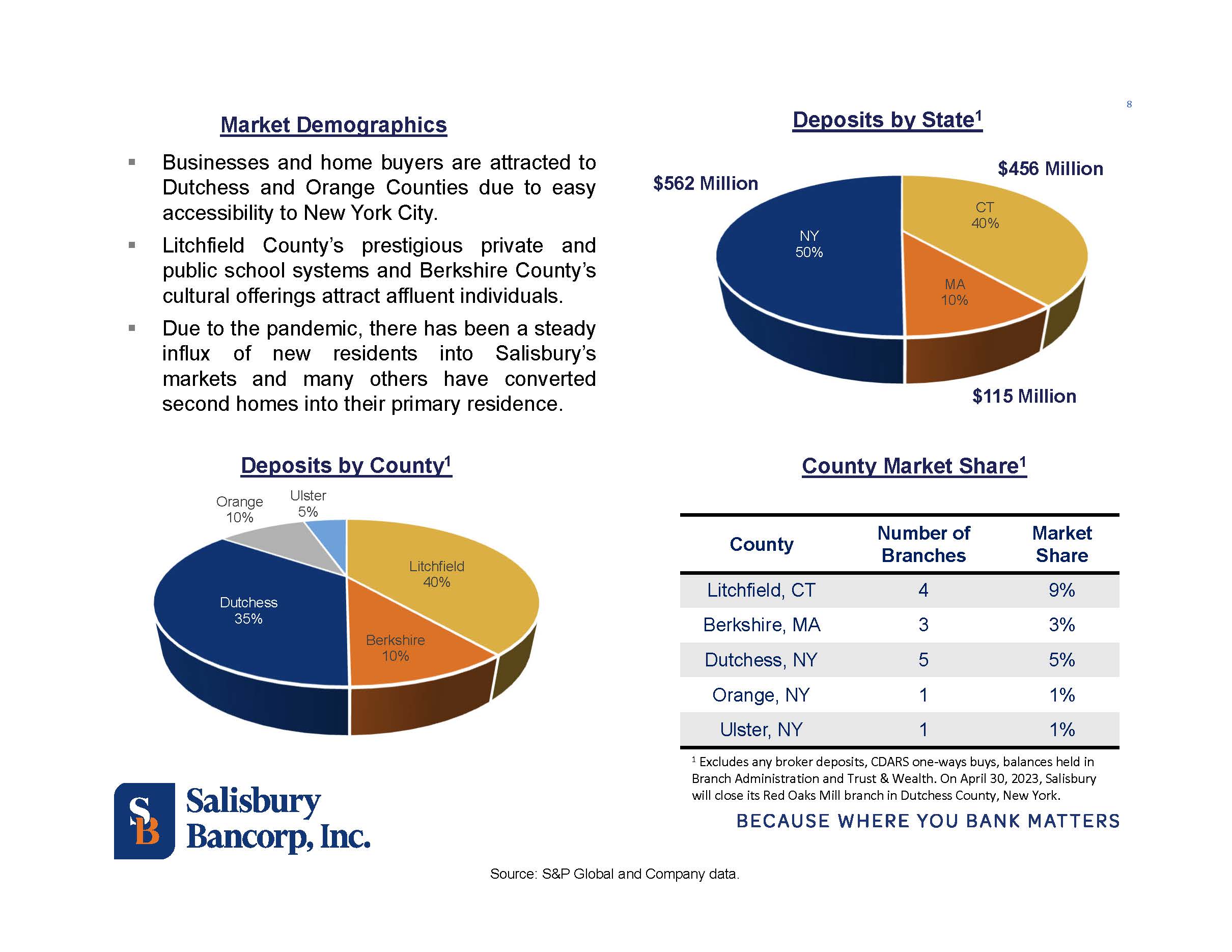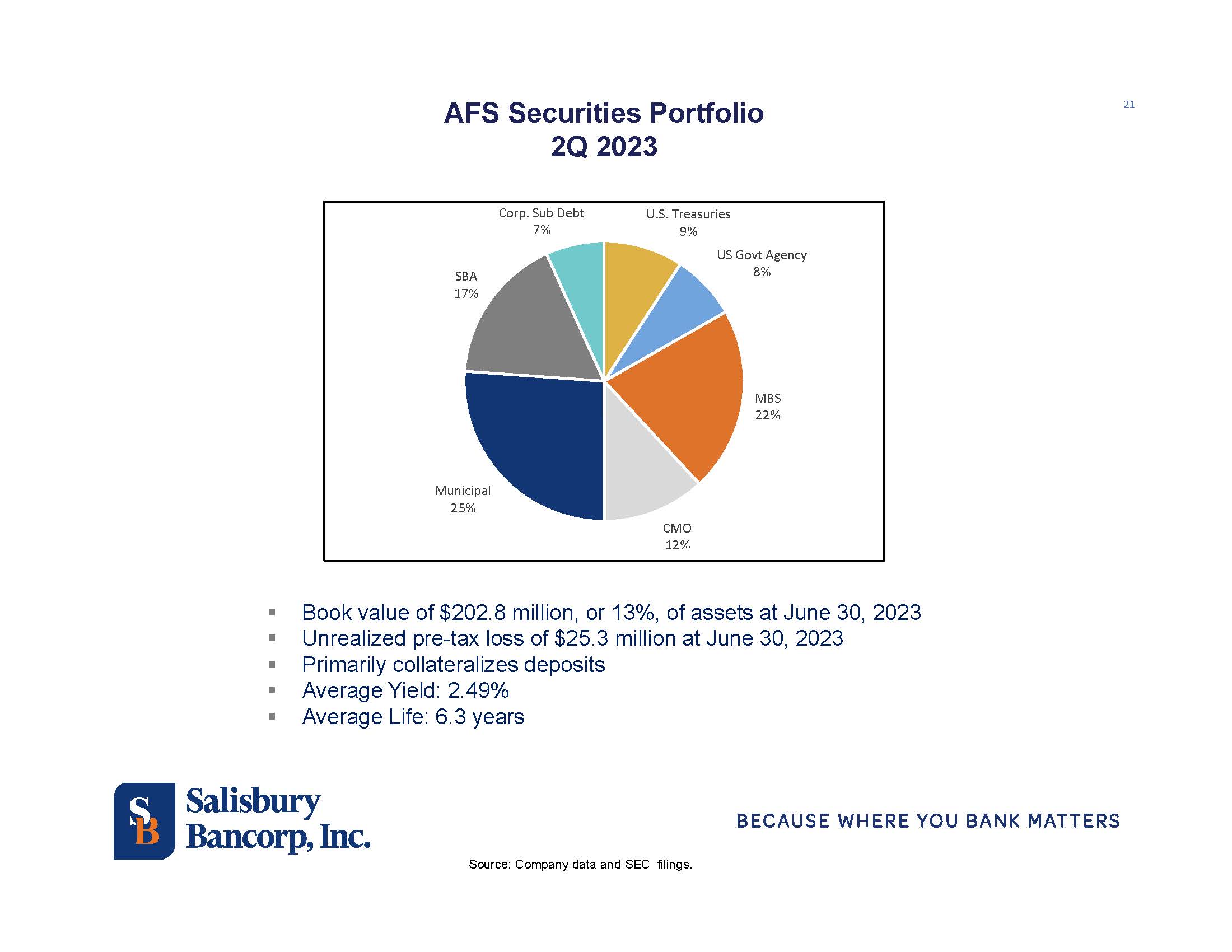 Salisbury’s President and Chief Executive Officer, Richard J. Cantele, Jr., stated, “Our results for the second quarter reflected the challenging macroeconomic and banking environment. While deposit balances increased during the quarter, and the credit quality of our loan portfolio remained strong, higher interest rates compressed net interest margin and earnings. Although the operating environment is likely to remain challenging in the near term, we are excited to have received regulatory approval for our strategic merger into NBT Bancorp. We believe Salisbury shareholders will benefit from the additional scale and expanded suite of products and services offered by NBT. I am extremely proud of the employees of Salisbury Bank who have worked diligently over the years to provide outstanding service to our customers and to give back to our communities. I am also grateful to our many customers for allowing us to partner and grow with them. I am confident that our customers will experience the same level of service from NBT.”