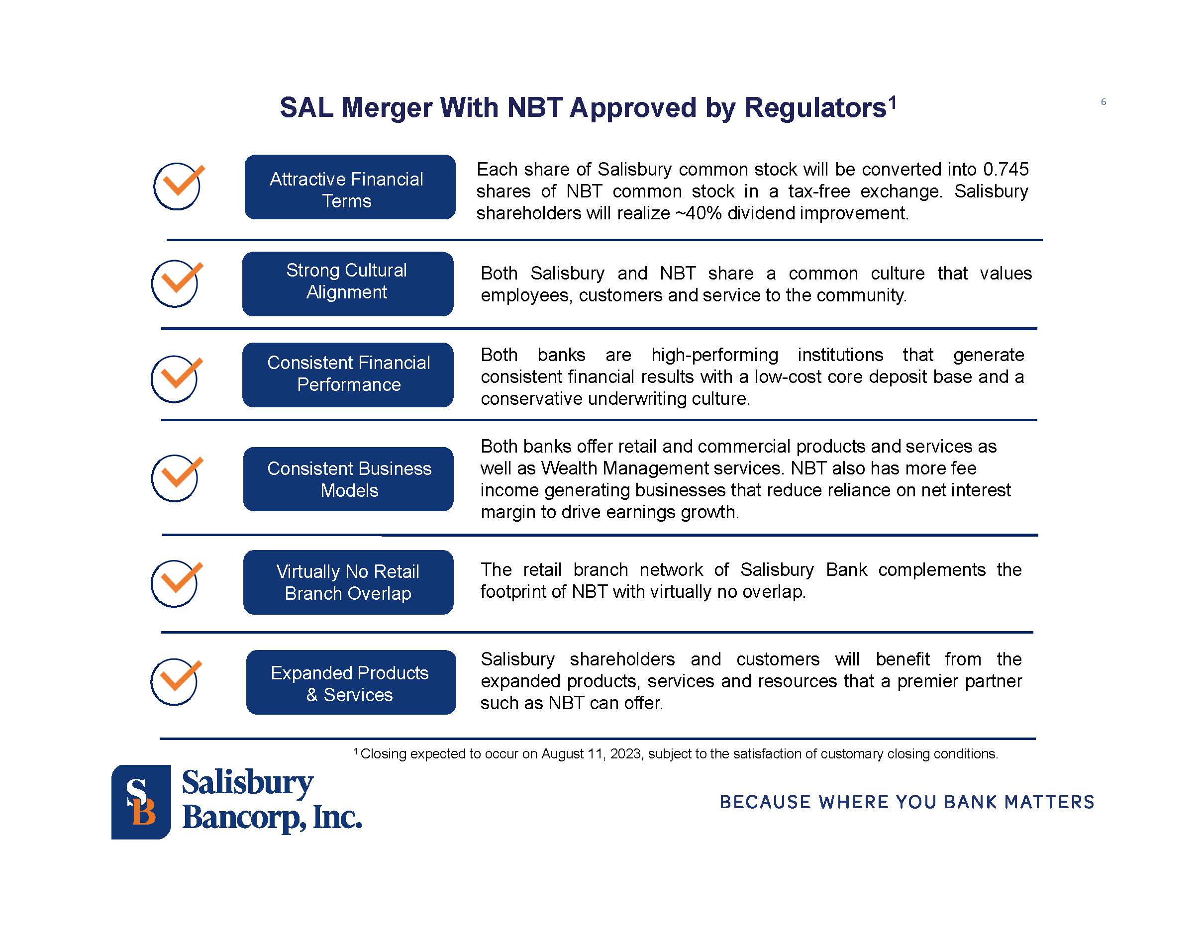 | · | Strategic Merger with NBT Bancorp Approved by Regulators; Merger Expected to Close in August 2023 |
