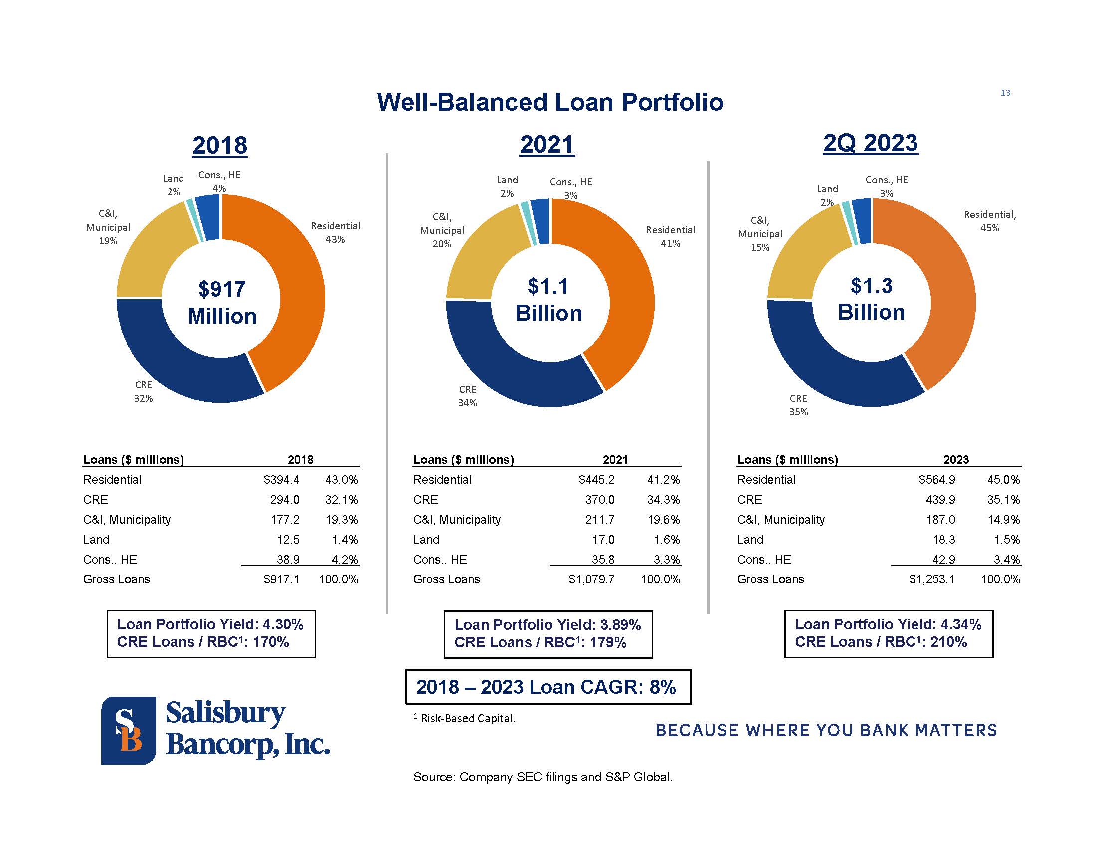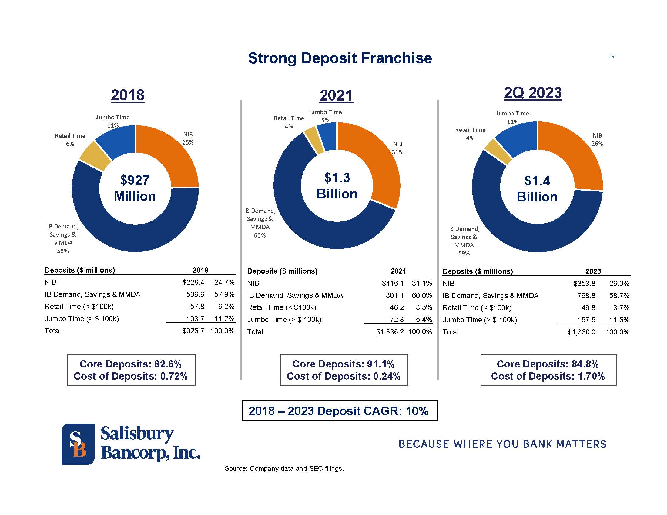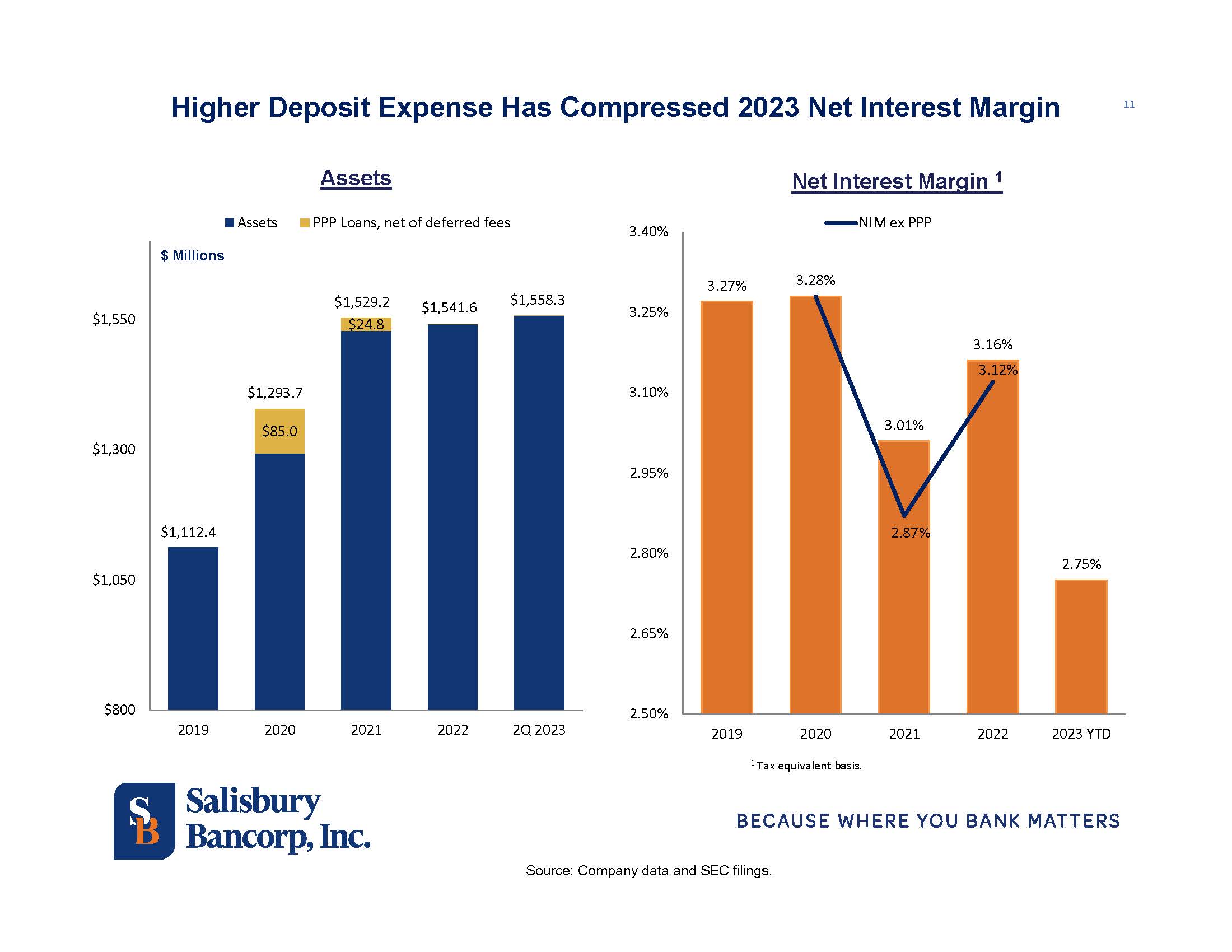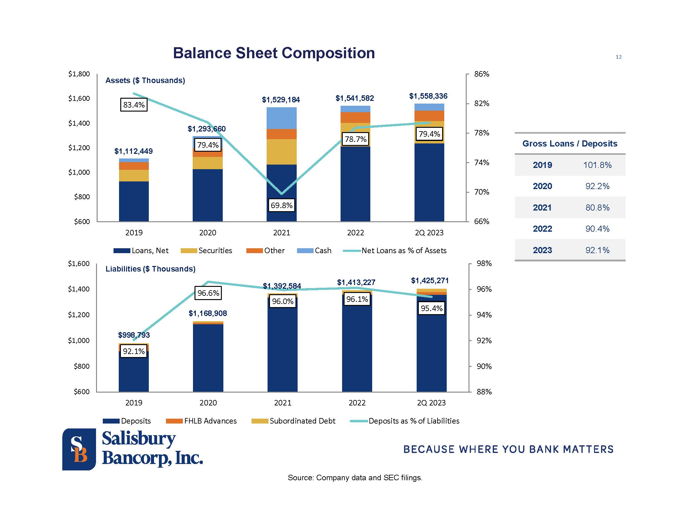 Average earning assets of $1.50 billion for second quarter 2023 increased $5.1 million, or 0.3%, from first quarter 2023, and increased $106.9 million, or 7.7%, versus second quarter 2022. Average earning assets for second quarter 2023 included average PPP loan balances of $0.2 million, net of deferred fees, compared $8.8 million in second quarter 2022. Average total interest bearing liabilities of $1.05 billion for second quarter 2023 increased $26.3 million, or 2.6%, from first quarter 2023 and increased $111.2 million, or 11.8%, versus second quarter 2022. The increase in average total interest-bearing liabilities from the comparative periods primarily reflected higher customer deposits and brokered deposits, which Salisbury utilized to fund loan growth and to provide liquidity.