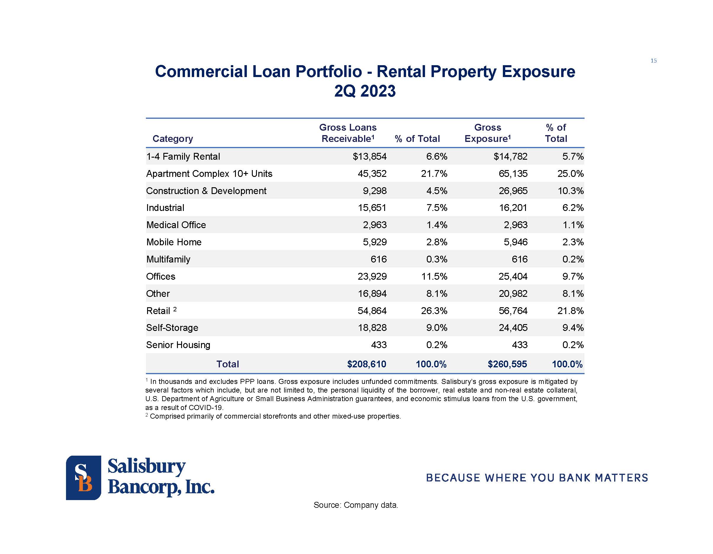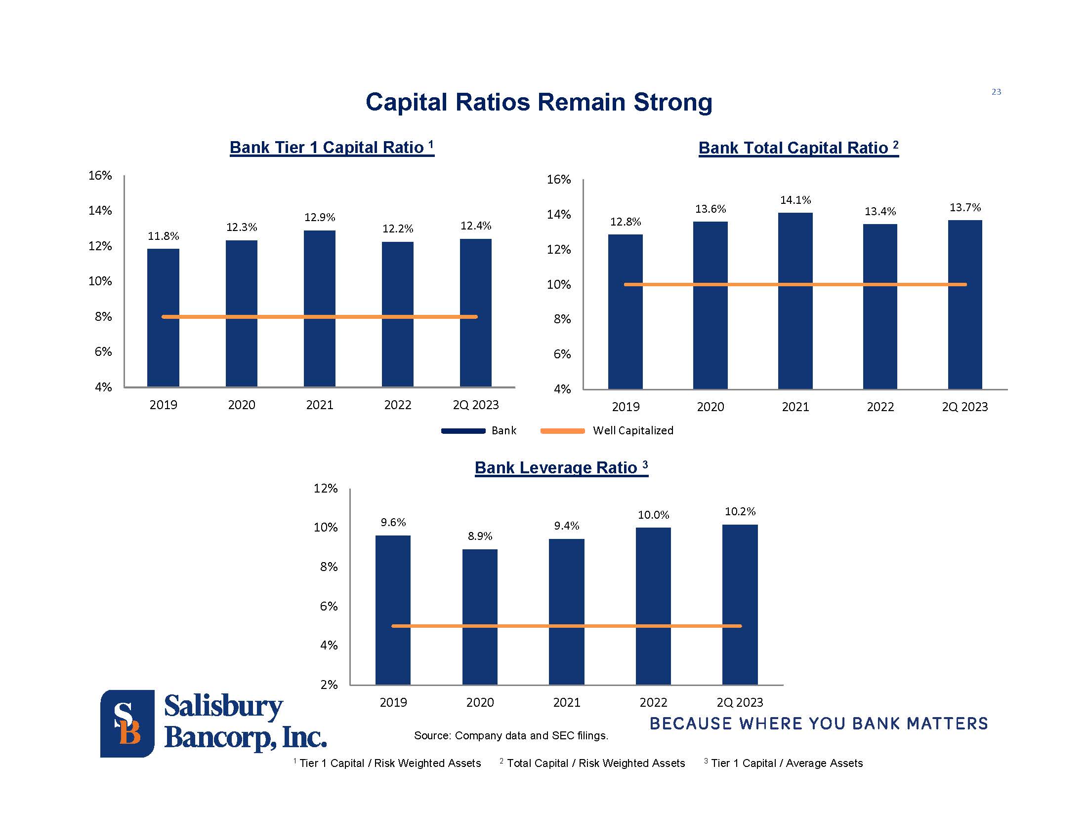 The effective income tax rates for second quarter 2023, first quarter 2023 and second quarter 2022 were 12.7%, 20.0% and 15.3%, respectively. The lower tax rate in second quarter 2023 was primarily attributed to the non-taxable BOLI proceeds noted above and a release of $163 thousand of reserves to reflect Salisbury’s estimated tax liability at June 30, 2023.