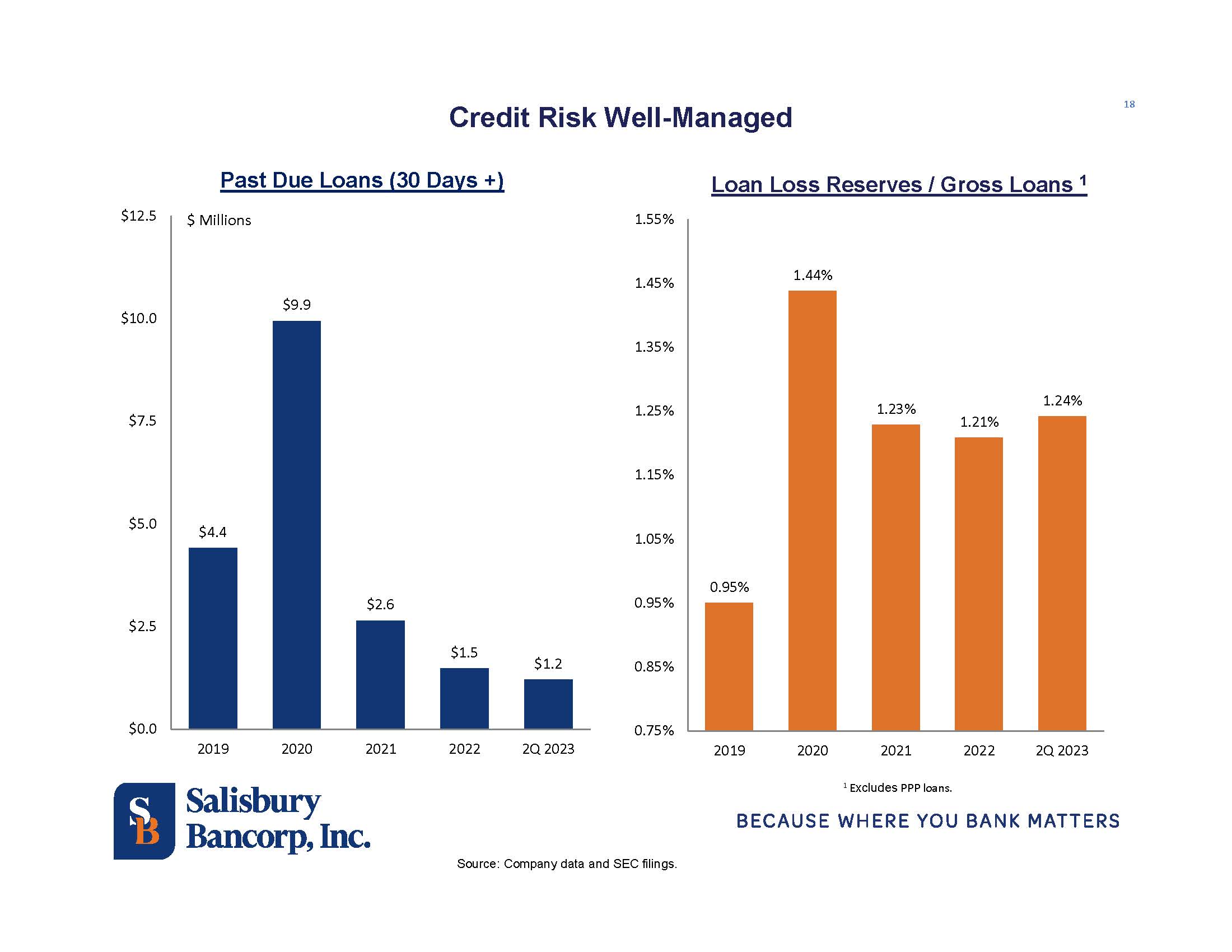 The allowance for credit losses for second quarter 2023 was $15.6 million compared with $16.0 million for first quarter 2023 and $13.7 million for second quarter 2022. The provision release for second quarter 2023 was $0.4 million compared with provision expenses of $0.9 million for first quarter 2023 and $1.1 million for second quarter 2022. The benefit for second quarter 2023 primarily reflected the release of reserves associated with the shared national credit commercial loans, which Salisbury sold during the quarter, and an improvement in the forecast of certain macro-economic factors, which underpin the Bank’s allowance for credit losses model. Net loan charge-offs were $47 thousand for the second quarter 2023 compared with $32 thousand for first quarter 2023 and $312 thousand for the second quarter 2022.