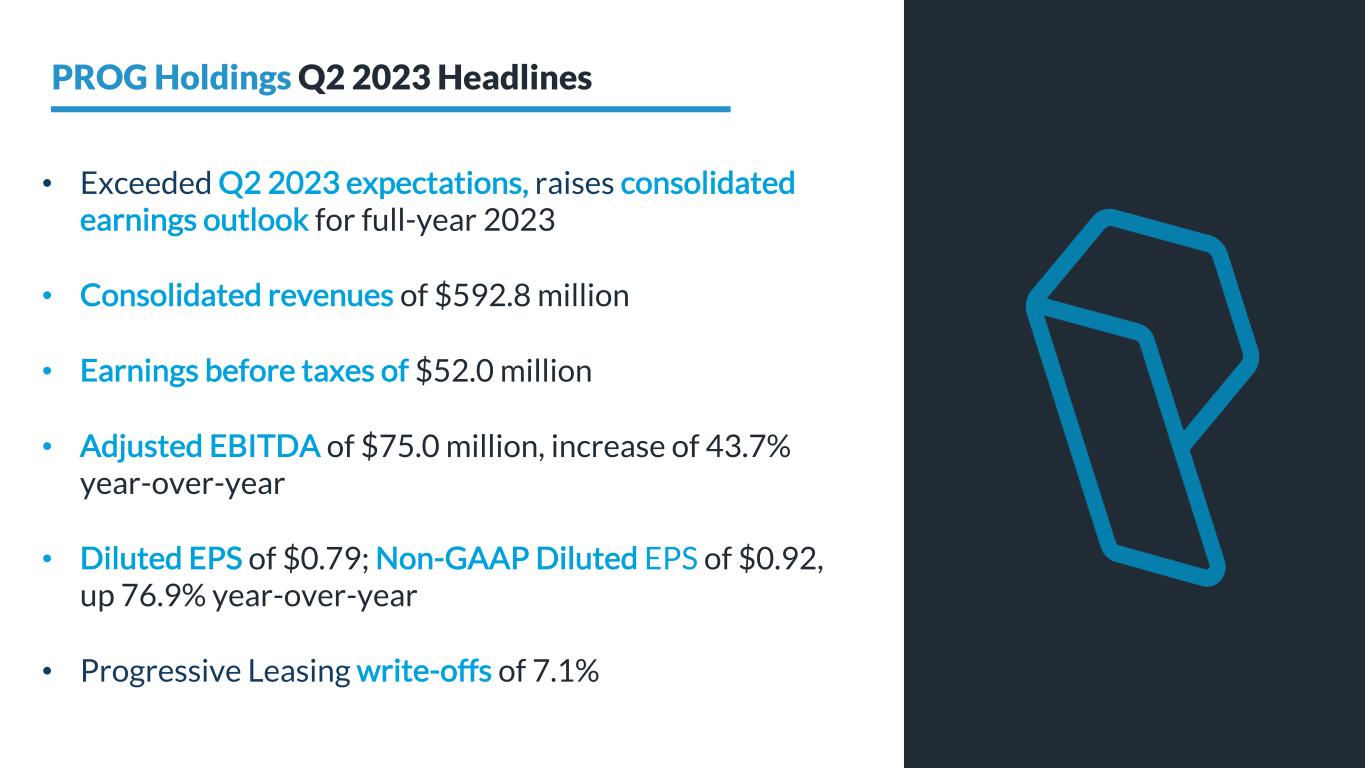 SALT LAKE CITY, July 26, 2023 - PROG Holdings, Inc. (NYSE:PRG), the fintech holding company for Progressive Leasing, Vive Financial, Four Technologies, and Build today announced financial results for the second quarter ended June 30, 2023.