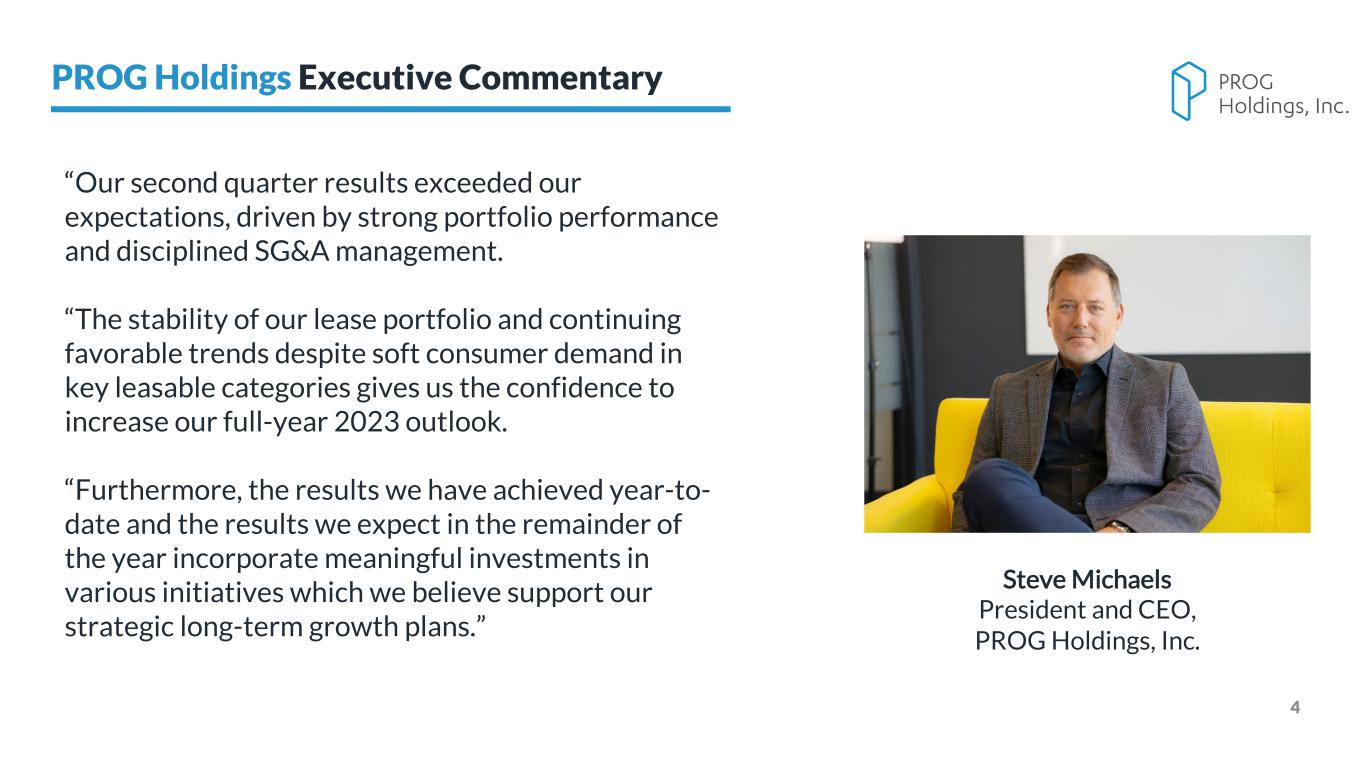 "Our second quarter results exceeded our expectations, driven by strong portfolio performance and disciplined SG&A management," said Steve Michaels, PROG Holdings' President and CEO. "The stability of our lease portfolio and continuing favorable trends, despite soft consumer demand in key leasable categories, gives us the confidence to increase our full-year 2023 outlook. Furthermore, the results we have achieved year-to-date and the results we expect in the remainder of the year incorporate meaningful investments in various initiatives which we believe support our strategic long-term growth plans," concluded Michaels.