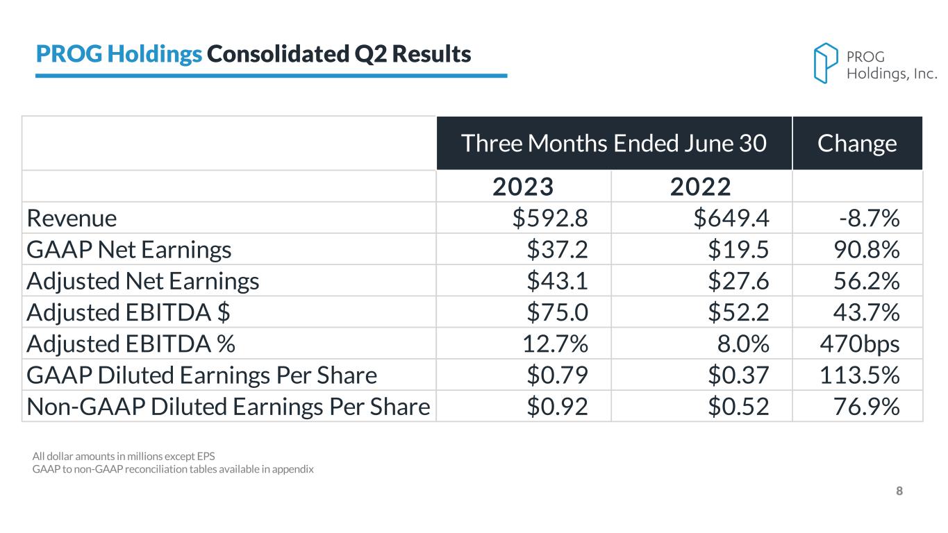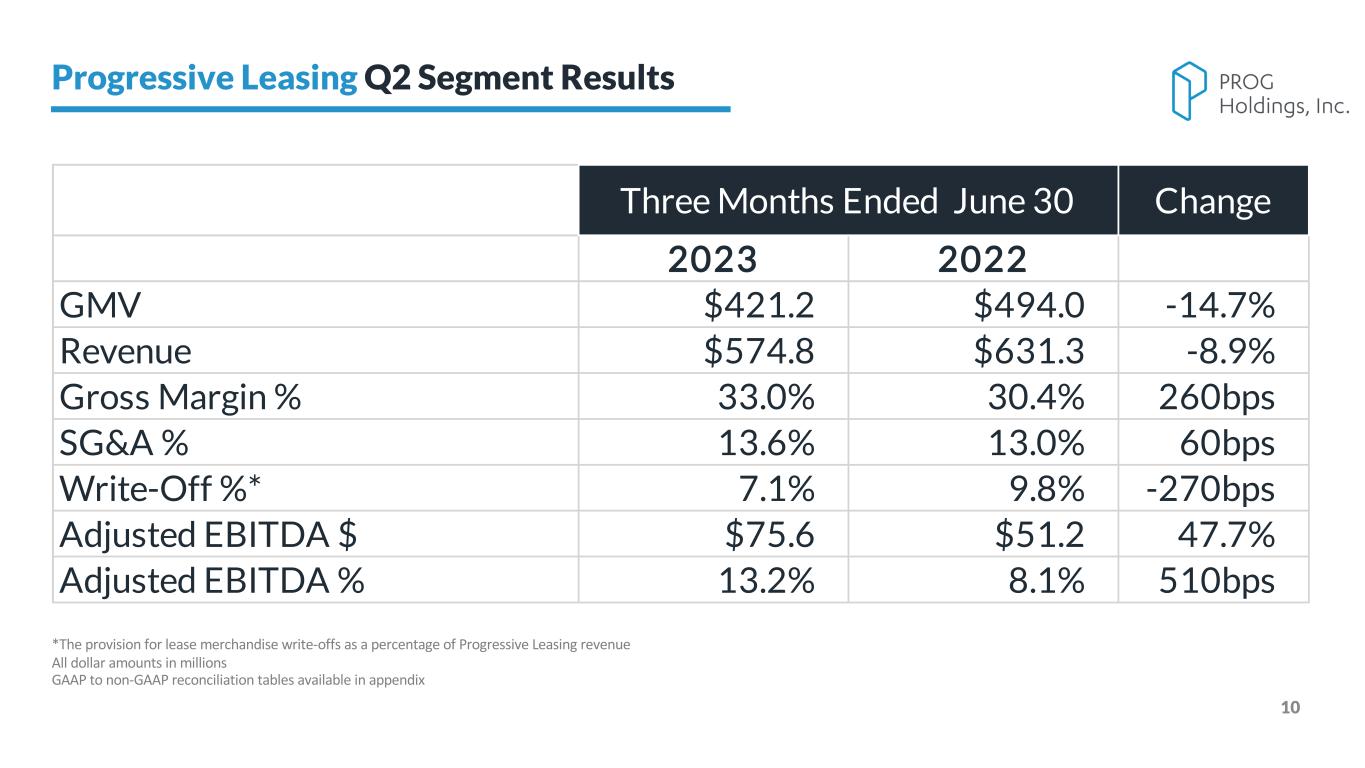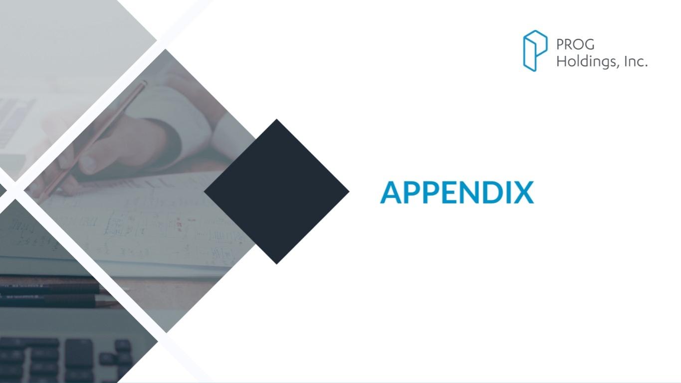 9*(Gross debt minus cash and cash equivalents) divided by trailing 12 month adjusted EBITDA PROG Holdings Consolidated Results Common Stock Repurchased Q2 2023 1.1M shares Cash and Cash Equivalents As of 6/30/2023 $252.8M Gross Debt As of 6/30/2023 $600M Net Leverage Ratio* As of 6/30/2023 1.14x Cash Flow From Operations As of 6/30/2023 $205.4M Common Stock Repurchase Amount Q2 2023 $35.4M