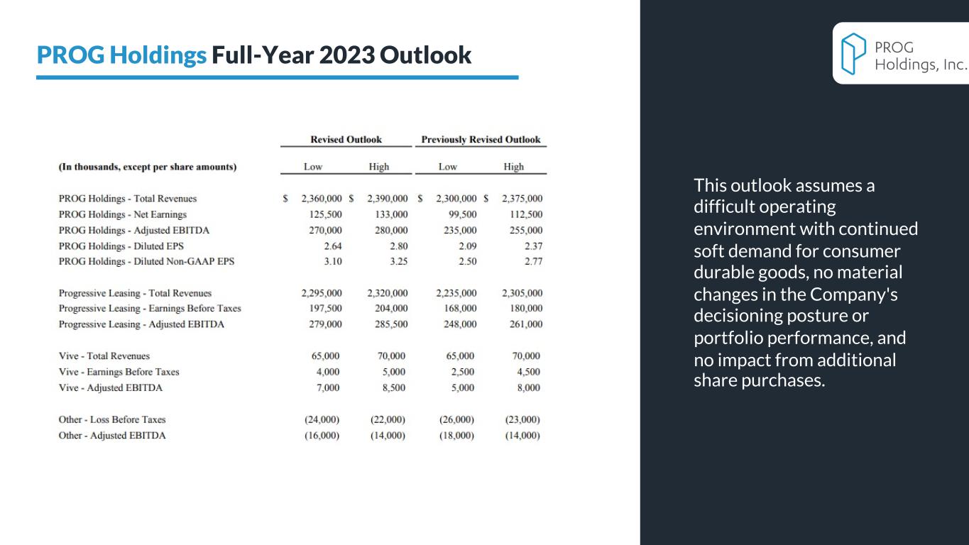 The Company is revising upwards its full year earnings and revenue outlook and providing a Q3 2023 outlook for revenues, net earnings, adjusted EBITDA, GAAP diluted EPS, and non-GAAP diluted EPS. The primary factors driving the increase in PROG Holdings' annual earnings outlook are the strength of the Company's earnings in the first half of 2023 and the expectation that improved gross margins from strong portfolio management will continue. This outlook assumes a difficult operating environment with continued soft demand for consumer durable goods, no material changes in the Company's decisioning posture or portfolio performance, and no impact from additional share purchases.