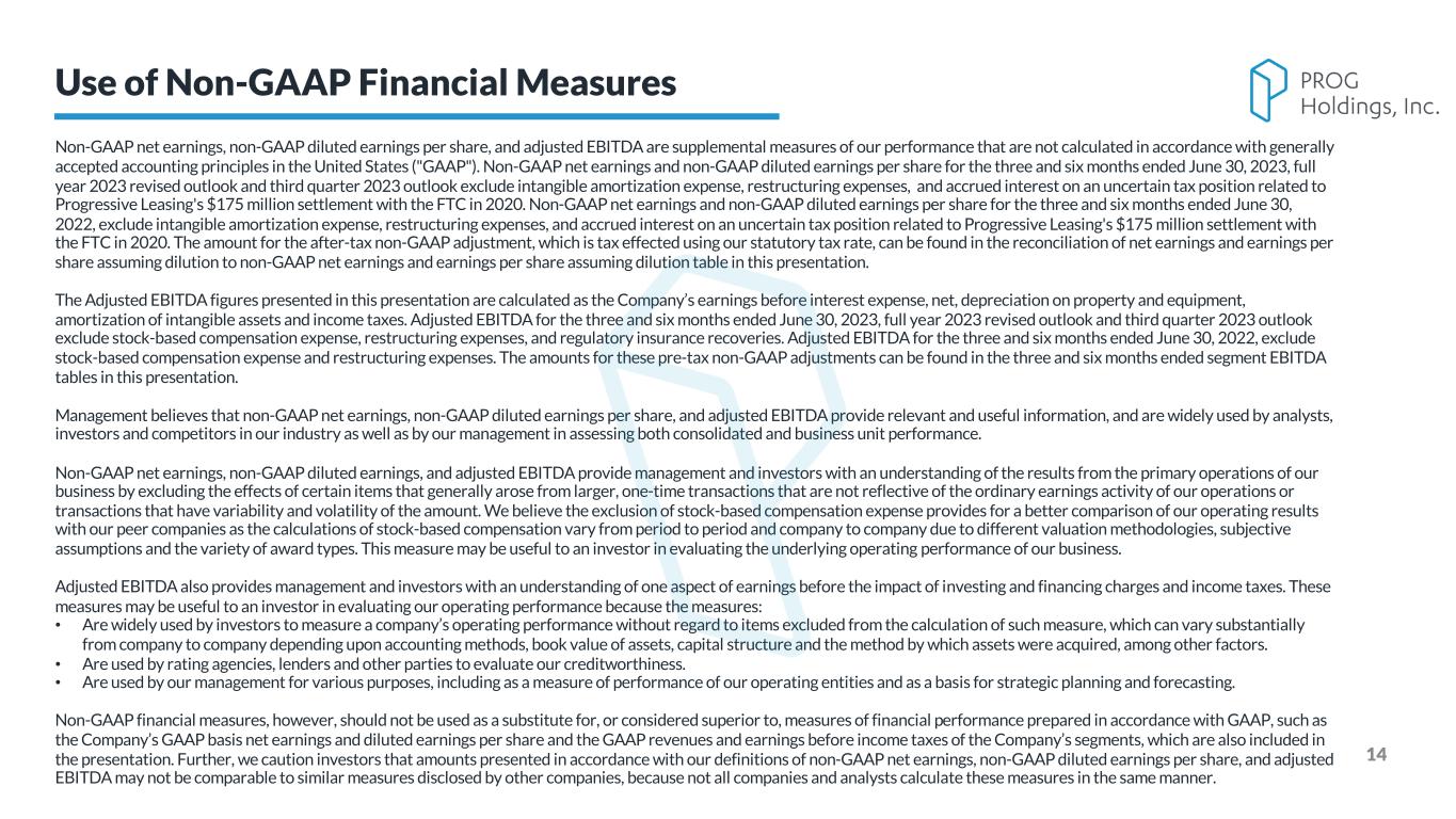Non-GAAP net earnings, non-GAAP diluted earnings per share, and adjusted EBITDA are supplemental measures of our performance that are not calculated in accordance with generally accepted accounting principles in the United States ("GAAP"). Non-GAAP net earnings and non-GAAP diluted earnings per share for the three and six months ended June 30, 2023, full year 2023 revised outlook and third quarter 2023 outlook exclude intangible amortization expense, restructuring expenses, and accrued interest on an uncertain tax position related to Progressive Leasing's $175 million settlement with the FTC in 2020. Non-GAAP net earnings and non-GAAP diluted earnings per share for the three and six months ended June 30, 2022, exclude intangible amortization expense, restructuring expenses, and accrued interest on an uncertain tax position related to Progressive Leasing's $175 million settlement with the FTC in 2020. The amount for the after-tax non-GAAP adjustment, which is tax effected using our statutory tax rate, can be found in the reconciliation of net earnings and earnings per share assuming dilution to non-GAAP net earnings and earnings per share assuming dilution table in this presentation. The Adjusted EBITDA figures presented in this presentation are calculated as the Company’s earnings before interest expense, net, depreciation on property and equipment, amortization of intangible assets and income taxes. Adjusted EBITDA for the three and six months ended June 30, 2023, full year 2023 revised outlook and third quarter 2023 outlook exclude stock-based compensation expense, restructuring expenses, and regulatory insurance recoveries. Adjusted EBITDA for the three and six months ended June 30, 2022, exclude stock-based compensation expense and restructuring expenses. The amounts for these pre-tax non-GAAP adjustments can be found in the three and six months ended segment EBITDA tables in this presentation. Management believes that non-GAAP net earnings, non-GAAP diluted earnings per share, and adjusted EBITDA provide relevant and useful information, and are widely used by analysts, investors and competitors in our industry as well as by our management in assessing both consolidated and business unit performance. Non-GAAP net earnings, non-GAAP diluted earnings, and adjusted EBITDA provide management and investors with an understanding of the results from the primary operations of our business by excluding the effects of certain items that generally arose from larger, one-time transactions that are not reflective of the ordinary earnings activity of our operations or transactions that have variability and volatility of the amount. We believe the exclusion of stock-based compensation expense provides for a better comparison of our operating results with our peer companies as the calculations of stock-based compensation vary from period to period and company to company due to different valuation methodologies, subjective assumptions and the variety of award types. This measure may be useful to an investor in evaluating the underlying operating performance of our business. Adjusted EBITDA also provides management and investors with an understanding of one aspect of earnings before the impact of investing and financing charges and income taxes. These measures may be useful to an investor in evaluating our operating performance because the measures: • Are widely used by investors to measure a company’s operating performance without regard to items excluded from the calculation of such measure, which can vary substantially from company to company depending upon accounting methods, book value of assets, capital structure and the method by which assets were acquired, among other factors. • Are used by rating agencies, lenders and other parties to evaluate our creditworthiness. • Are used by our management for various purposes, including as a measure of performance of our operating entities and as a basis for strategic planning and forecasting. Non-GAAP financial measures, however, should not be used as a substitute for, or considered superior to, measures of financial performance prepared in accordance with GAAP, such as the Company’s GAAP basis net earnings and diluted earnings per share and the GAAP revenues and earnings before income taxes of the Company’s segments, which are also included in the presentation. Further, we caution investors that amounts presented in accordance with our definitions of non-GAAP net earnings, non-GAAP diluted earnings per share, and adjusted EBITDA may not be comparable to similar measures disclosed by other companies, because not all companies and analysts calculate these measures in the same manner. 14 Use of Non-GAAP Financial Measures