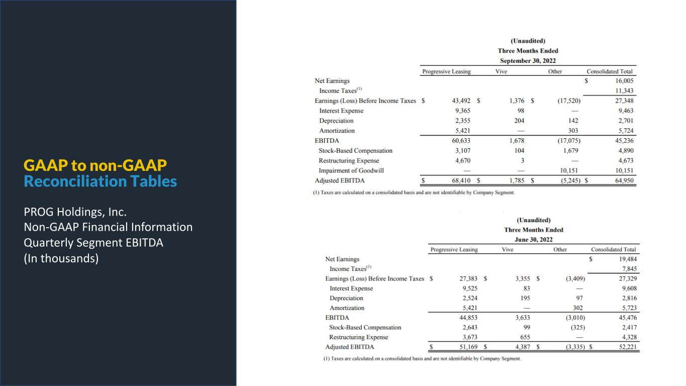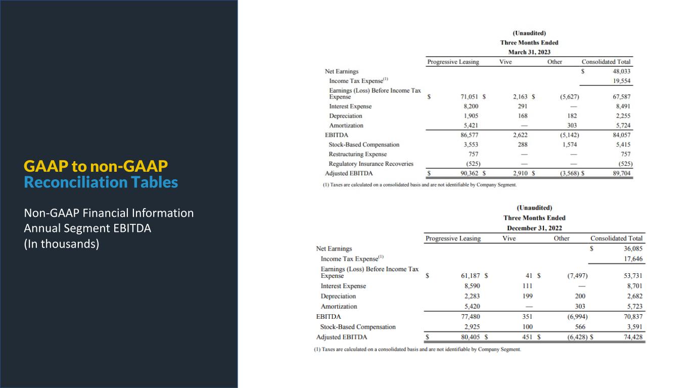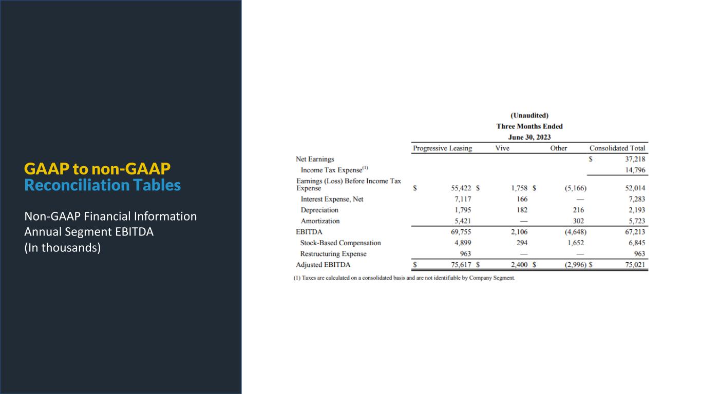 2 Statements in this earnings supplement regarding our business that are not historical facts are "forward-looking statements" that involve risks and uncertainties which could cause actual results to differ materially from those contained in the forward-looking statements. Such forward-looking statements generally can be identified by the use of forward-looking terminology, such as "continuing", “expect”, “believe”, "outlook" and similar forward-looking terminology. These risks and uncertainties include factors such as (i) continued volatility and challenges in the macro environment and, in particular, the unfavorable effects on our business of the rapid increase in the rate of inflation currently being experienced in the economy, which has not been seen in more than forty years, significant increases in interest rates, and fears of a recession, and the impact of those headwinds on: (a) consumer confidence and customer demand for the merchandise that our POS partners sell; (b) our customers’ disposable income and their ability to make the lease and loan payments they owe the company; (c) the availability of consumer credit; (d) our labor costs; and (e) our overall financial performance and outlook; (ii) our businesses being subject to extensive laws and regulations, including laws and regulations unique to the industries in which our businesses operate, that may subject them to government investigations and significant monetary penalties and compliance-related burdens, as well as an increased focus by federal, state and local regulators on the industries within which our businesses operate, including with respect to consumer protection, customer privacy, third party and employee fraud and information security; (iii) deteriorating macroeconomic conditions resulting in the algorithms and other proprietary decisioning tools used in approving Progressive Leasing and Vive customers for leases and loans no longer being indicative of their ability to perform, which may limit the ability of those businesses to avoid lease and loan charge-offs or may result in their reserves being insufficient to cover actual losses; (iv) a large percentage of the company’s revenues being concentrated with several of Progressive Leasing’s key POS partners; (v) the risks that Progressive Leasing will be unable to attract new POS partners or retain and grow its business with its existing POS partners; (vi) Vive’s and Four’s business models differing significantly from Progressive Leasing’s, which creates specific and unique risks for the Vive and Four businesses, including Vive’s reliance on two bank partners to issue its credit products and Vive’s and Four’s exposure to the unique regulatory risks associated with the laws and regulations that apply to their businesses; (vii) the risks that interruptions, inventory shortages and other factors affecting the supply chains of our retail partners having a material and adverse effect on several aspects of our performance; (viii) the impact of the COVID-19 pandemic, including new variants, subvariants or additional waves of COVID-19 infections, on: (a) demand for the lease-to-own products offered by our Progressive Leasing segment, (b) Progressive Leasing’s point-of-sale or "POS" partners, and Vive’s and Four’s merchant partners, (c) Progressive Leasing’s, Vive’s and Four’s customers, including their ability and willingness to satisfy their obligations under their lease agreements and loan agreements, (d) Progressive Leasing’s POS partners being able to obtain the merchandise their customers need or desire, (e) our employees and labor needs, including our ability to adequately staff our operations, (f) our financial and operational performance, and (g) our liquidity; (ix) changes in the enforcement of existing laws and regulations and the adoption of new laws and regulations that may unfavorably impact our businesses; (x) the risk that our capital allocation strategy, including our current share repurchase program, will not be effective at enhancing shareholder value; (xi) our cost reduction initiatives may not be adequate or may have unintended consequences that could be disruptive to our businesses; (xii) the loss of the services of our key executives or our inability to attract and retain key talent, particularly with respect to our information technology function, may have a material adverse impact on our operations; (xiii) increased competition from traditional and virtual lease-to-own competitors and also from competitors of our Vive segment; (xiv) adverse consequences to Progressive Leasing, including additional monetary penalties and/or injunctive relief, if it fails to comply with the terms of its 2020 settlement with the FTC, as well as the possibility of other regulatory authorities and third parties bringing legal actions against Progressive Leasing based on the same allegations that led to the FTC settlement; (xv) our increased level of indebtedness; (xvi) our ability to protect confidential, proprietary, or sensitive information, including the personal and confidential information of our customers, which may be adversely affected by cyber-attacks, employee or other internal misconduct, computer viruses, electronic break-ins or "hacking", or similar disruptions, any one of which could have a material adverse impact on our results of operations, financial condition, and prospects; and (xvii) the other risks and uncertainties discussed under "Risk Factors" in the Company’s Annual Report on Form 10-K for the fiscal year ended December 31, 2022, filed with the SEC on February 22, 2023. Statements in this earnings supplement that are "forward-looking" include without limitation statements about: (i) the performance and stability of our lease portfolio; (ii) our ability to continue making investments in initiatives to support our strategic long-term growth plans and the outcomes of those initiatives; (iii) Progressive Leas