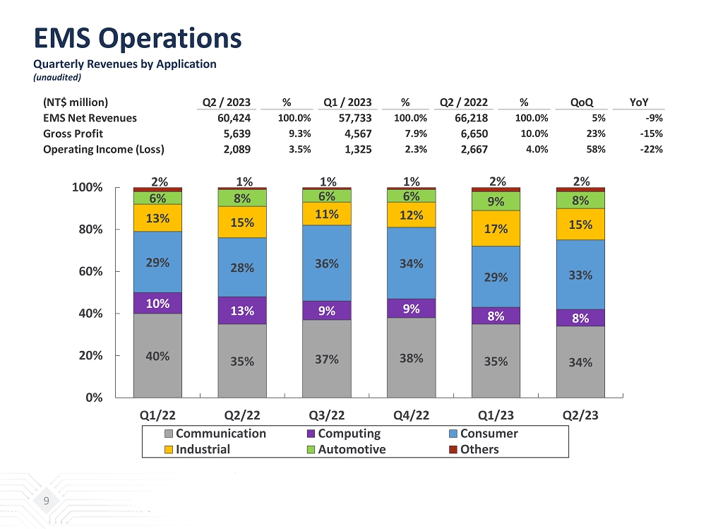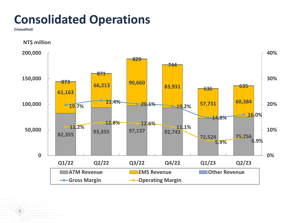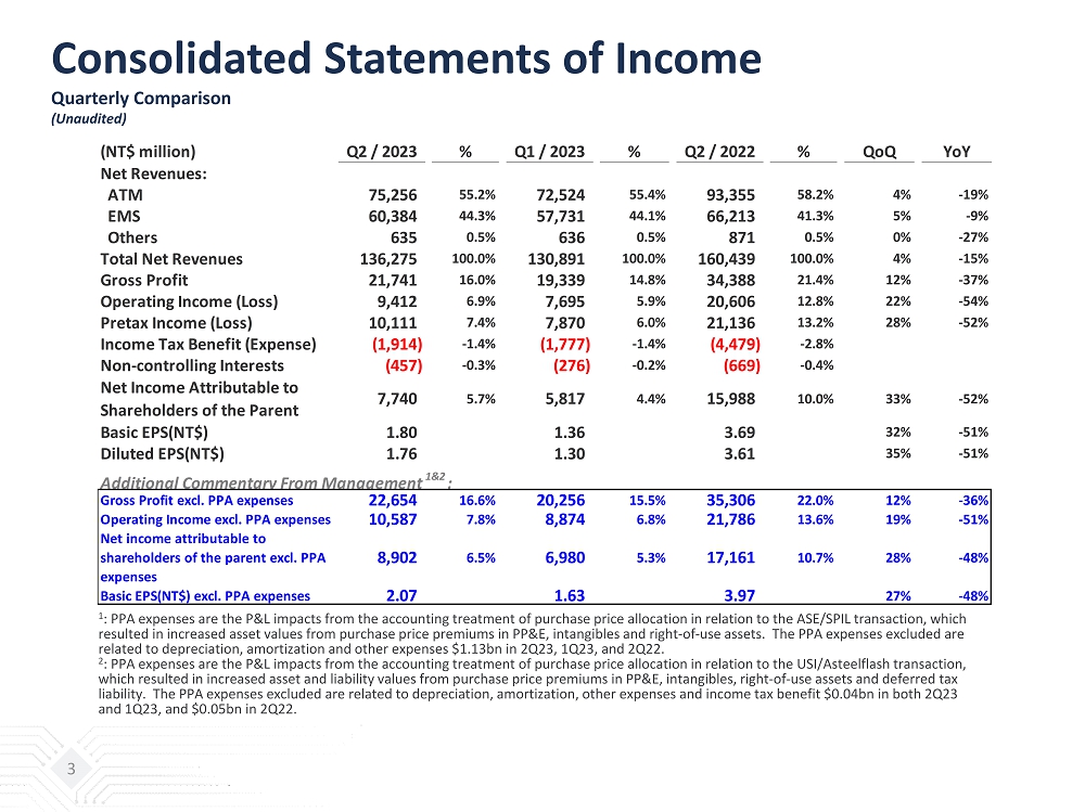 Consolidated Statements of Income Quarterly Comparison (Unaudited) 3 (NT$ million) Q2 / 2023 % Q1 / 2023 % Q2 / 2022 % QoQ YoY Net Revenues: ATM 75,256 55.2% 72,524 55.4% 93,355 58.2% 4% -19% EMS 60,384 44.3% 57,731 44.1% 66,213 41.3% 5% -9% Others 635 0.5% 636 0.5% 871 0.5% 0% -27% Total Net Revenues 136,275 100.0% 130,891 100.0% 160,439 100.0% 4% -15% Gross Profit 21,741 16.0% 19,339 14.8% 34,388 21.4% 12% -37% Operating Income (Loss) 9,412 6.9% 7,695 5.9% 20,606 12.8% 22% -54% Pretax Income (Loss) 10,111 7.4% 7,870 6.0% 21,136 13.2% 28% -52% Income Tax Benefit (Expense) (1,914) -1.4% (1,777) -1.4% (4,479) -2.8% Non-controlling Interests (457) -0.3% (276) -0.2% (669) -0.4% Net Income Attributable to Shareholders of the Parent 7,740 5.7% 5,817 4.4% 15,988 10.0% 33% -52% Basic EPS(NT$) 1.80 1.36 3.69 32% -51% Diluted EPS(NT$) 1.76 1.30 3.61 35% -51% Additional Commentary From Management 1&2 : Gross Profit excl. PPA expenses 22,654 16.6% 20,256 15.5% 35,306 22.0% 12% -36% Operating Income excl. PPA expenses 10,587 7.8% 8,874 6.8% 21,786 13.6% 19% -51% Net income attributable to shareholders of the parent excl. PPA expenses 8,902 6.5% 6,980 5.3% 17,161 10.7% 28% -48% Basic EPS(NT$) excl. PPA expenses 2.07 1.63 3.97 27% -48% 1 : PPA expenses are the P&L impacts from the accounting treatment of purchase price allocation in relation to the ASE/SPIL trans act ion, which resulted in increased asset values from purchase price premiums in PP&E, intangibles and right - of - use assets. The PPA expenses excluded are related to depreciation, amortization and other expenses $1.13bn in 2Q23, 1Q23, and 2Q22. 2 : PPA expenses are the P&L impacts from the accounting treatment of purchase price allocation in relation to the USI/ Asteelflash transaction, which resulted in increased asset and liability values from purchase price premiums in PP&E, intangibles, right - of - use assets an d deferred tax liability. The PPA expenses excluded are related to depreciation, amortization, other expenses and income tax benefit $0.04bn in both 2Q23 and 1Q23, and $0.05bn in 2Q22 .