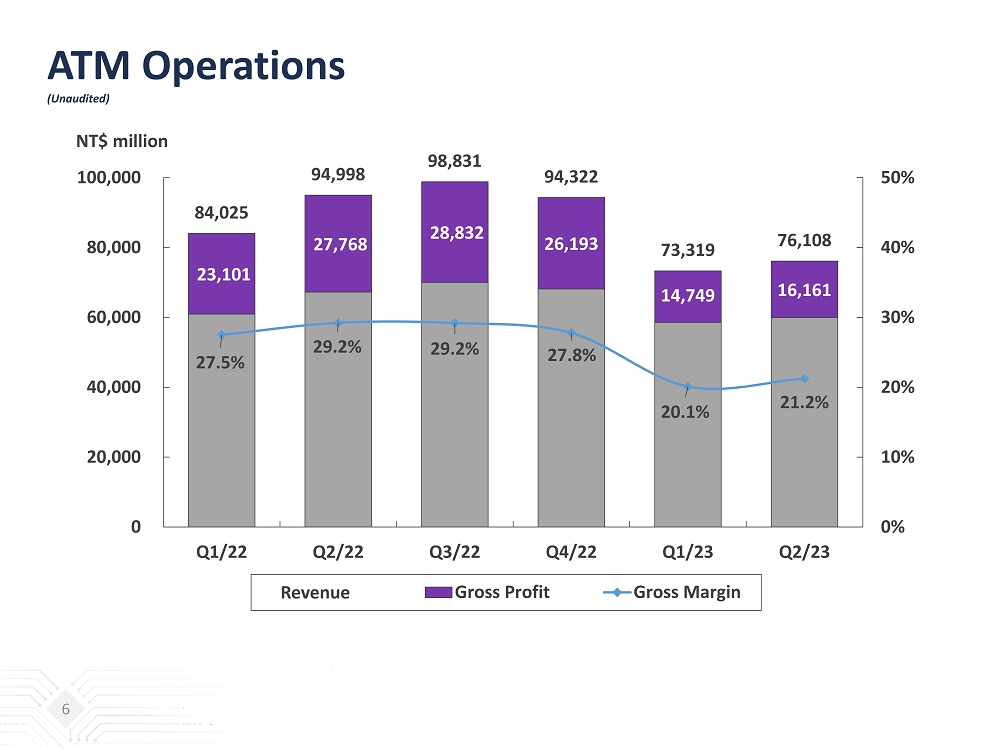 ATM Statements of Income Quarterly Comparison (Unaudited) 5 (NT$ million) Q2 / 2023 % Q1 / 2023 % Q2 / 2022 % QoQ YoY Net Revenues: Packaging 62,607 82.3% 60,770 82.9% 79,894 84.1% 3% -22% Testing 12,292 16.1% 11,407 15.6% 13,760 14.5% 8% -11% Direct Material 1,165 1.5% 1,106 1.5% 1,288 1.3% 5% -10% Others 44 0.1% 36 0.0% 56 0.1% 22% -21% Total Net Revenues 76,108 100.0% 73,319 100.0% 94,998 100.0% 4% -20% Gross Profit 16,161 21.2% 14,749 20.1% 27,768 29.2% 10% -42% Operating Income (Loss) 7,405 9.7% 6,409 8.7% 17,995 18.9% 16% -59% Additional Commentary From Management 1 : Gross Profit excl. PPA expenses 17,035 22.4% 15,624 21.3% 28,645 30.2% 9% -41% Operating Income excl. PPA expenses 8,529 11.2% 7,534 10.3% 19,122 20.1% 13% -55% 1 : PPA expenses are the P&L impacts from the accounting treatment of purchase price allocation in relation to the ASE/SPIL transacti on, which resulted in increased asset values from purchase price premiums in PP&E, intangibles and right - of - use assets. The PPA expenses e xcluded are related to depreciation and amortization $1.12bn in 2Q23, and $ 1.13bn in both 1Q23 and 2Q22.