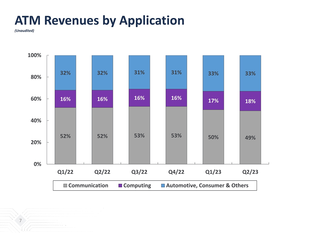 ATM Operations (Unaudited) 6 23,101 27,768 28,832 26,193 14,749 16,161 84,025 94,998 98,831 94,322 73,319 76,108 27.5% 29.2% 29.2% 27.8% 20.1% 21.2% 0% 10% 20% 30% 40% 50% 0 20,000 40,000 60,000 80,000 100,000 Q1/22 Q2/22 Q3/22 Q4/22 Q1/23 Q2/23 NT$ million Gross Profit Gross Margin Revenue
