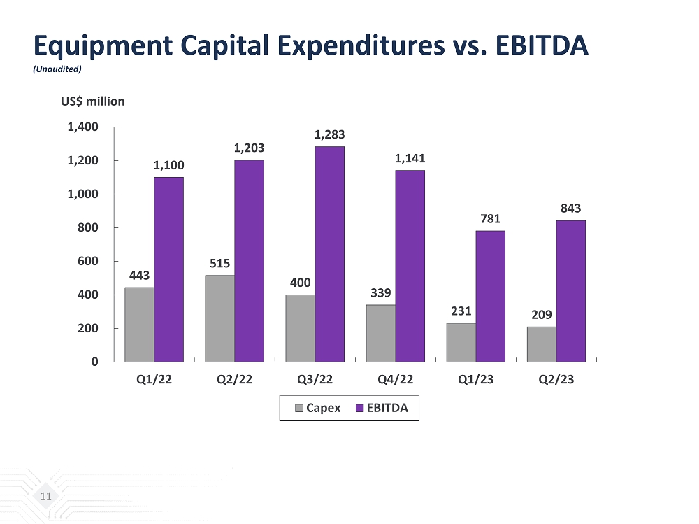 Key Balance Sheet Items & Indices (Unaudited) 10 (NT$ million) Jun. 30, 2023 Mar. 31, 2023 Cash and cash equivalent $59,351 $62,056 Financial assets - current 7,040 6,317 Financial assets - non current & investments - equity method 26,761 24,352 Property, plant & equipment 262,604 266,005 Total assets 672,521 675,440 Short-term loans 37,798 45,158 Current portion of bonds payable 13,797 7,298 Current portion of long-term loans 4,394 4,701 Bonds payable 33,462 38,837 Long-term loans & long-term bills payable 90,224 86,752 Total interest bearing debts 187,081 190,300 Total liabilities 375,104 385,714 Total equity (Including non-controlling interest) 297,417 289,726 Quarterly EBITDA 25,770 23,765 Current ratio 1.20 1.16 Net debt to equity ratio 0.41 0.42
