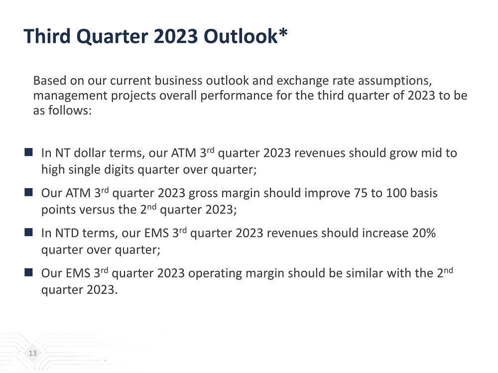Third Quarter 2023 Outlook* Based on our current business outlook and exchange rate assumptions, management projects overall performance for the third quarter of 2023 to be as follows: In NT dollar terms, our ATM 3 rd quarter 2023 revenues should grow mid to high single digits quarter over quarter ; Our ATM 3 rd quarter 2023 gross margin should improve 75 to 100 basis points versus the 2 nd quarter 2023; In NTD terms, our EMS 3 rd quarter 2023 revenues should increase 20% quarter over quarter ; Our EMS 3 rd quarter 2023 operating margin should be similar with the 2 nd quarter 2023 . 13