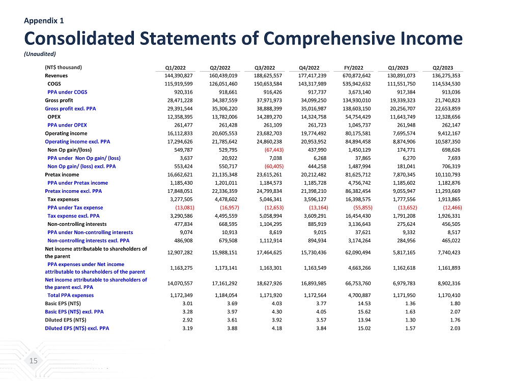 Appendix 1 Consolidated Statements of Comprehensive Income (Unaudited) 15 (NT$ thousand) Q1/2022 Q2/2022 Q3/2022 Q4/2022 FY/2022 Q1/2023 Q2/2023 Revenues 144,390,827 160,439,019 188,625,557 177,417,239 670,872,642 130,891,073 136,275,353 COGS 115,919,599 126,051,460 150,653,584 143,317,989 535,942,632 111,551,750 114,534,530 PPA under COGS 920,316 918,661 916,426 917,737 3,673,140 917,384 913,036 Gross profit 28,471,228 34,387,559 37,971,973 34,099,250 134,930,010 19,339,323 21,740,823 Gross profit excl. PPA 29,391,544 35,306,220 38,888,399 35,016,987 138,603,150 20,256,707 22,653,859 OPEX 12,358,395 13,782,006 14,289,270 14,324,758 54,754,429 11,643,749 12,328,656 PPA under OPEX 261,477 261,428 261,109 261,723 1,045,737 261,948 262,147 Operating income 16,112,833 20,605,553 23,682,703 19,774,492 80,175,581 7,695,574 9,412,167 Operating income excl. PPA 17,294,626 21,785,642 24,860,238 20,953,952 84,894,458 8,874,906 10,587,350 Non Op gain/(loss) 549,787 529,795 (67,443) 437,990 1,450,129 174,771 698,626 PPA under Non Op gain/ (loss) 3,637 20,922 7,038 6,268 37,865 6,270 7,693 Non Op gain/ (loss) excl. PPA 553,424 550,717 (60,405) 444,258 1,487,994 181,041 706,319 Pretax income 16,662,621 21,135,348 23,615,261 20,212,482 81,625,712 7,870,345 10,110,793 PPA under Pretax income 1,185,430 1,201,011 1,184,573 1,185,728 4,756,742 1,185,602 1,182,876 Pretax income excl. PPA 17,848,051 22,336,359 24,799,834 21,398,210 86,382,454 9,055,947 11,293,669 Tax expenses 3,277,505 4,478,602 5,046,341 3,596,127 16,398,575 1,777,556 1,913,865 PPA under Tax expense (13,081) (16,957) (12,653) (13,164) (55,855) (13,652) (12,466) Tax expense excl. PPA 3,290,586 4,495,559 5,058,994 3,609,291 16,454,430 1,791,208 1,926,331 Non-controlling interests 477,834 668,595 1,104,295 885,919 3,136,643 275,624 456,505 PPA under Non-controlling interests 9,074 10,913 8,619 9,015 37,621 9,332 8,517 Non-controlling interests excl. PPA 486,908 679,508 1,112,914 894,934 3,174,264 284,956 465,022 Net income attributable to shareholders of the parent 12,907,282 15,988,151 17,464,625 15,730,436 62,090,494 5,817,165 7,740,423 PPA expenses under Net income attributable to shareholders of the parent 1,163,275 1,173,141 1,163,301 1,163,549 4,663,266 1,162,618 1,161,893 Net income attributable to shareholders of the parent excl. PPA 14,070,557 17,161,292 18,627,926 16,893,985 66,753,760 6,979,783 8,902,316 Total PPA expenses 1,172,349 1,184,054 1,171,920 1,172,564 4,700,887 1,171,950 1,170,410 Basic EPS (NT$) 3.01 3.69 4.03 3.77 14.53 1.36 1.80 Basic EPS (NT$) excl. PPA 3.28 3.97 4.30 4.05 15.62 1.63 2.07 Diluted EPS (NT$) 2.92 3.61 3.92 3.57 13.94 1.30 1.76 Diluted EPS (NT$) excl. PPA 3.19 3.88 4.18 3.84 15.02 1.57 2.03
