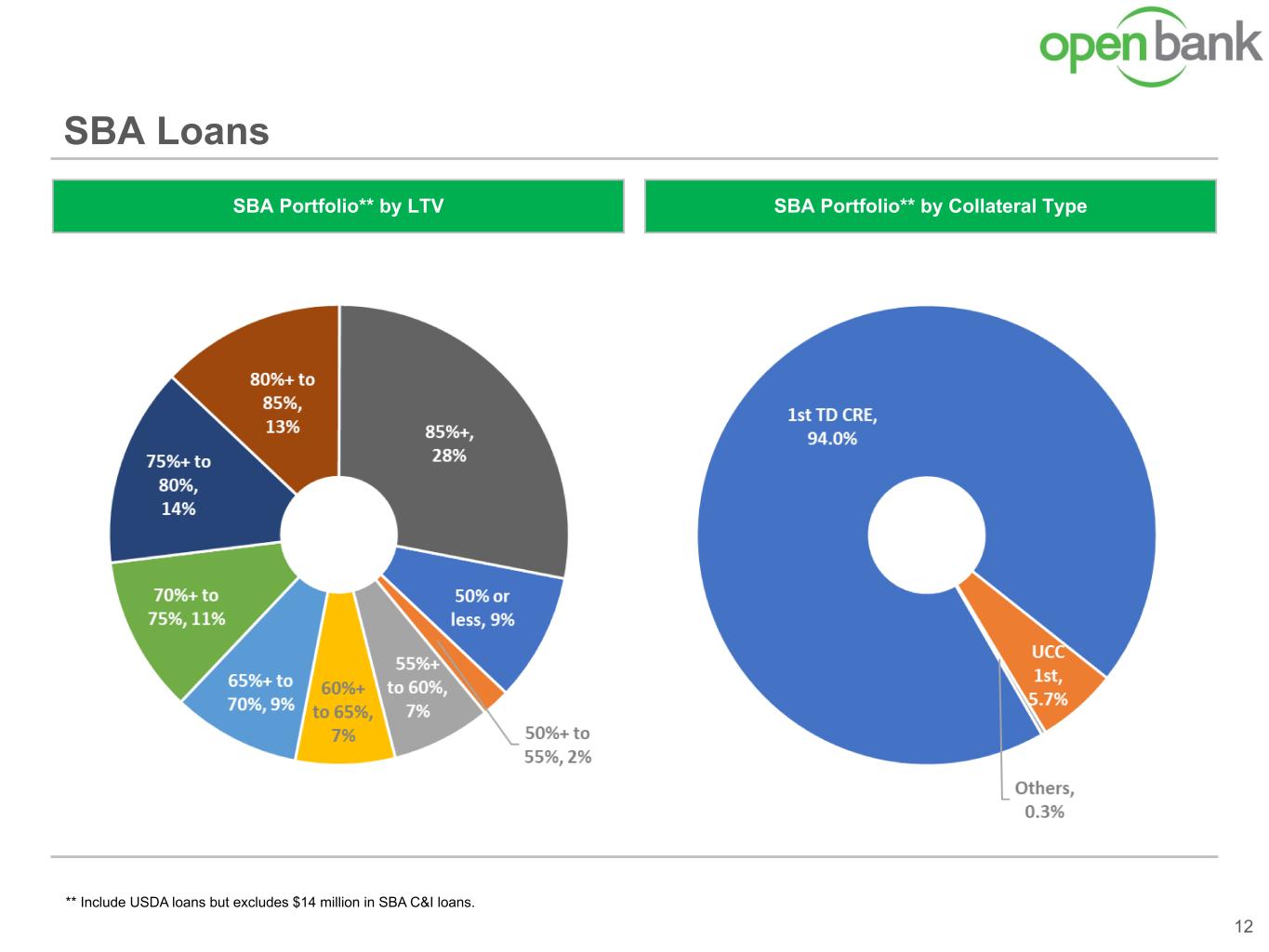 ** Include USDA loans but excludes $14 million in SBA C&I loans. SBA Loans 12 SBA Portfolio** by Collateral TypeSBA Portfolio** by LTV