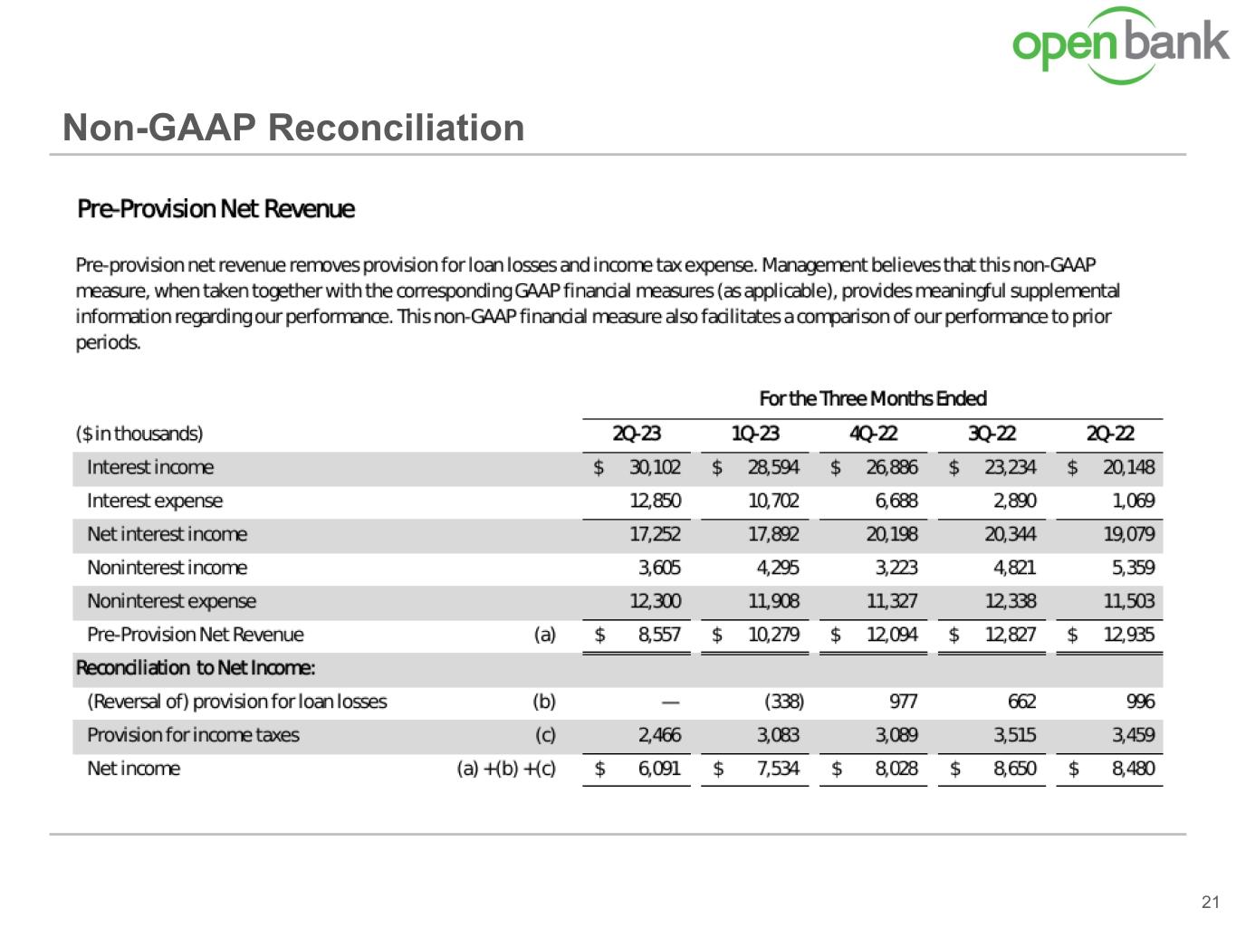 LOS ANGELES, July 27, 2023 — OP Bancorp (the “Company”) (NASDAQ: OPBK), the holding company of Open Bank (the “Bank”), today reported its financial results for the second quarter of 2023. Net income for the second quarter of 2023 was $6.1 million, or $0.39 per diluted common share, compared with $7.5 million, or $0.48 per diluted common share, for the first quarter of 2023, and $8.5 million, or $0.54 per diluted common share, for the second quarter of 2022.