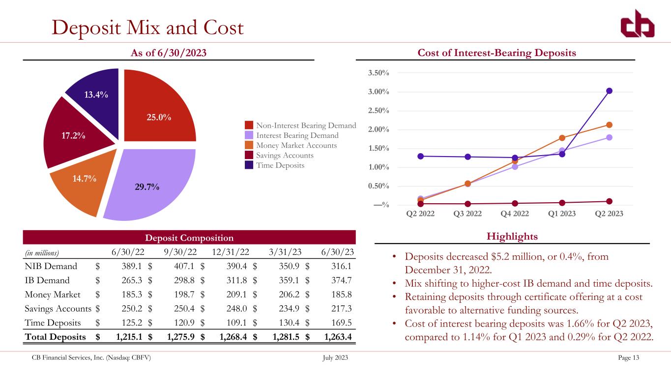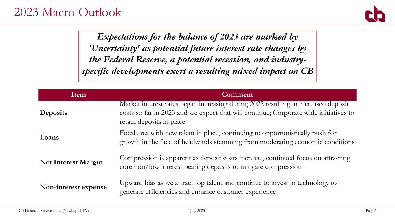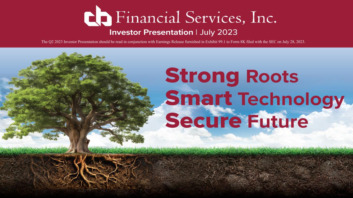 WASHINGTON, PA., July 28, 2023 -- CB Financial Services, Inc. (“CB” or the “Company”) (NASDAQGM: CBFV), the holding company of Community Bank (the “Bank”) and Exchange Underwriters, Inc. (“EU”), a wholly-owned insurance subsidiary of the Bank, today announced its second quarter and year-to-date 2023 financial results.