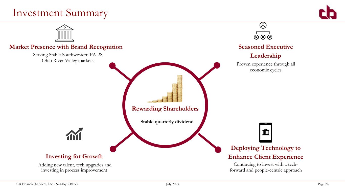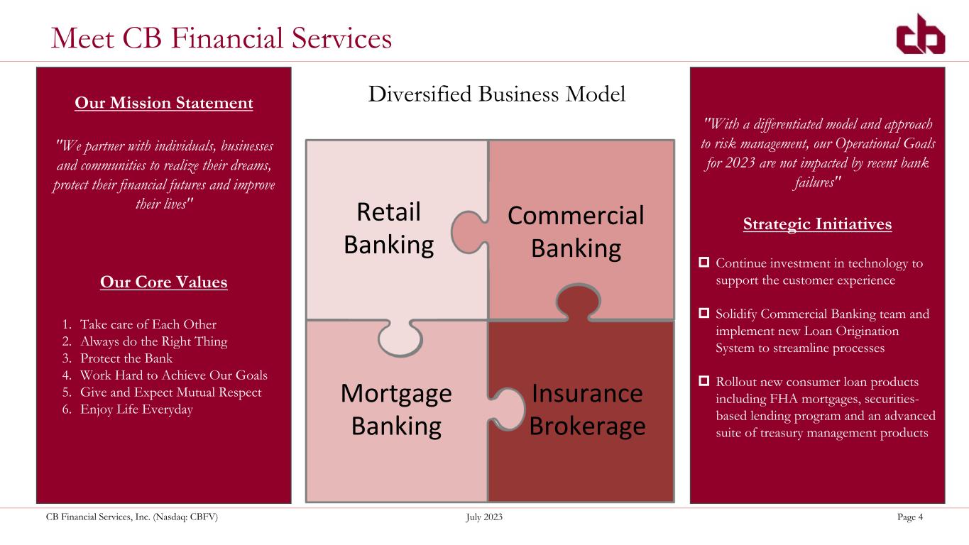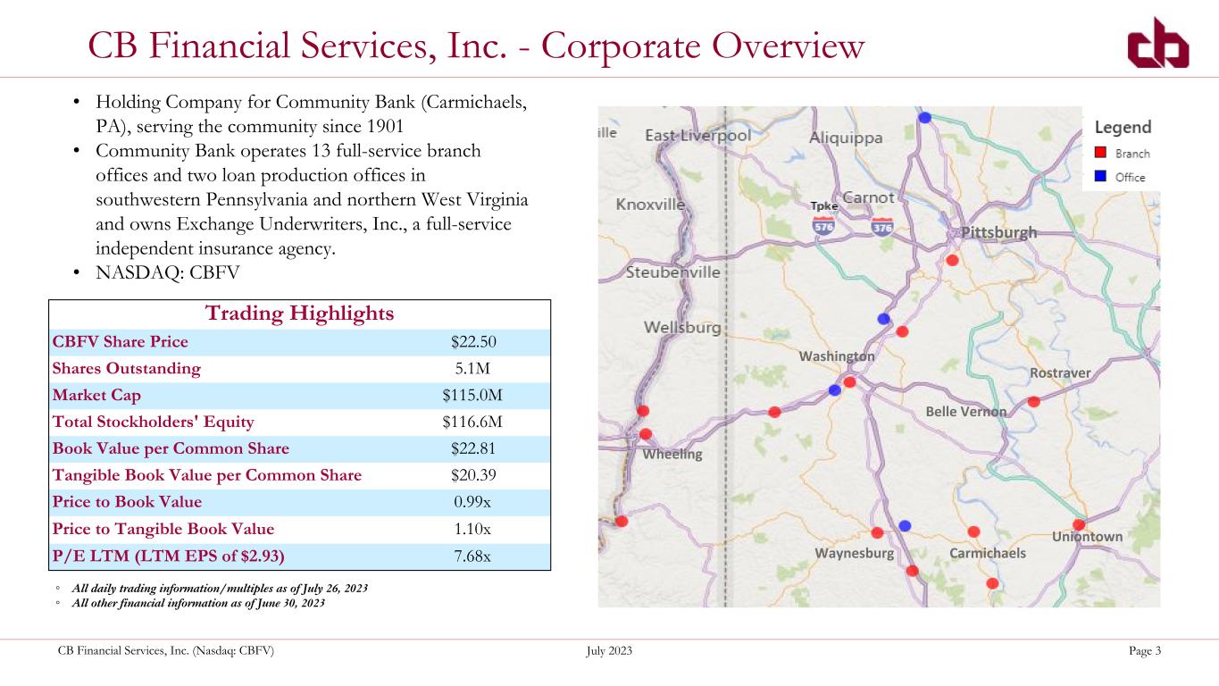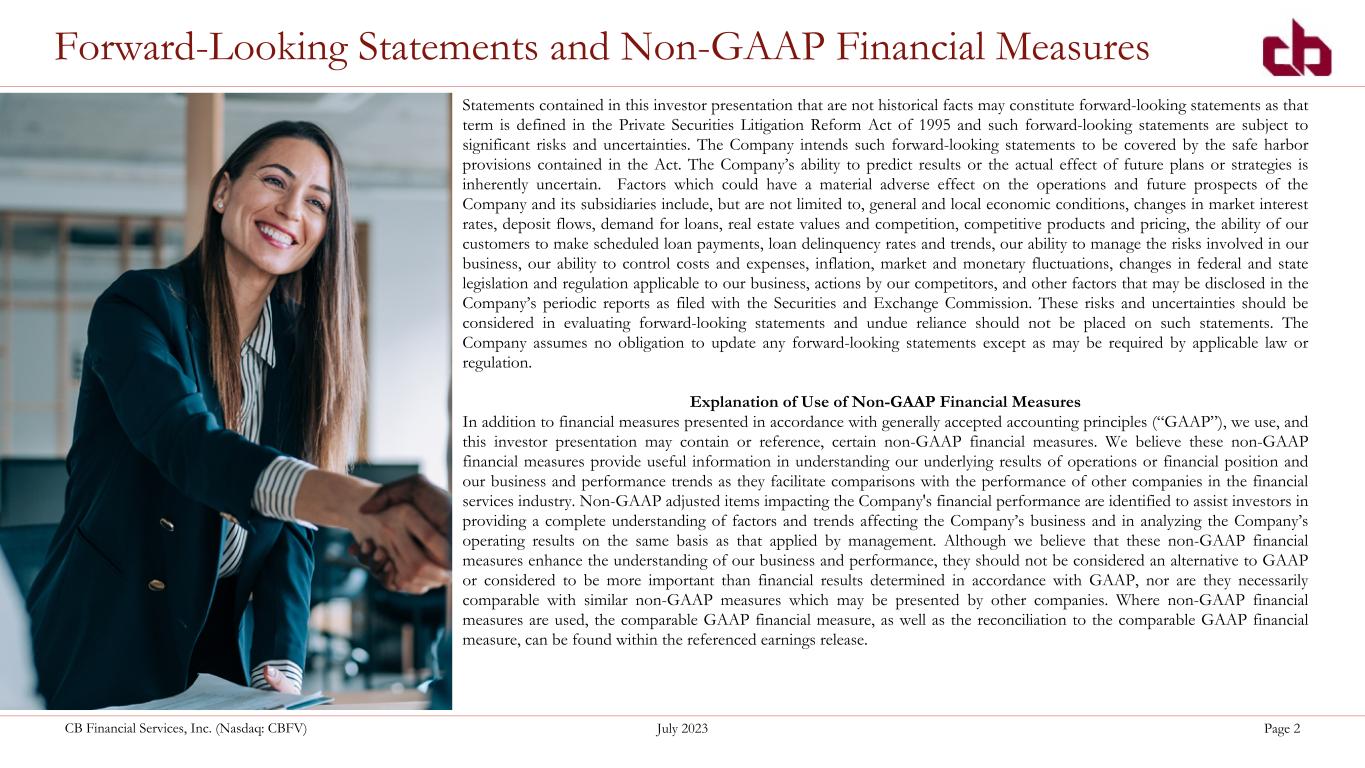 CB Financial Services, Inc. (Nasdaq: CBFV) July 2023 Page 2 Forward-Looking Statements and Non-GAAP Financial Measures Statements contained in this investor presentation that are not historical facts may constitute forward-looking statements as that term is defined in the Private Securities Litigation Reform Act of 1995 and such forward-looking statements are subject to significant risks and uncertainties. The Company intends such forward-looking statements to be covered by the safe harbor provisions contained in the Act. The Company’s ability to predict results or the actual effect of future plans or strategies is inherently uncertain. Factors which could have a material adverse effect on the operations and future prospects of the Company and its subsidiaries include, but are not limited to, general and local economic conditions, changes in market interest rates, deposit flows, demand for loans, real estate values and competition, competitive products and pricing, the ability of our customers to make scheduled loan payments, loan delinquency rates and trends, our ability to manage the risks involved in our business, our ability to control costs and expenses, inflation, market and monetary fluctuations, changes in federal and state legislation and regulation applicable to our business, actions by our competitors, and other factors that may be disclosed in the Company’s periodic reports as filed with the Securities and Exchange Commission. These risks and uncertainties should be considered in evaluating forward-looking statements and undue reliance should not be placed on such statements. The Company assumes no obligation to update any forward-looking statements except as may be required by applicable law or regulation. Explanation of Use of Non-GAAP Financial Measures In addition to financial measures presented in accordance with generally accepted accounting principles (“GAAP”), we use, and this investor presentation may contain or reference, certain non-GAAP financial measures. We believe these non-GAAP financial measures provide useful information in understanding our underlying results of operations or financial position and our business and performance trends as they facilitate comparisons with the performance of other companies in the financial services industry. Non-GAAP adjusted items impacting the Company's financial performance are identified to assist investors in providing a complete understanding of factors and trends affecting the Company’s business and in analyzing the Company’s operating results on the same basis as that applied by management. Although we believe that these non-GAAP financial measures enhance the understanding of our business and performance, they should not be considered an alternative to GAAP or considered to be more important than financial results determined in accordance with GAAP, nor are they necessarily comparable with similar non-GAAP measures which may be presented by other companies. Where non-GAAP financial measures are used, the comparable GAAP financial measure, as well as the reconciliation to the comparable GAAP financial measure, can be found within the referenced earnings release.