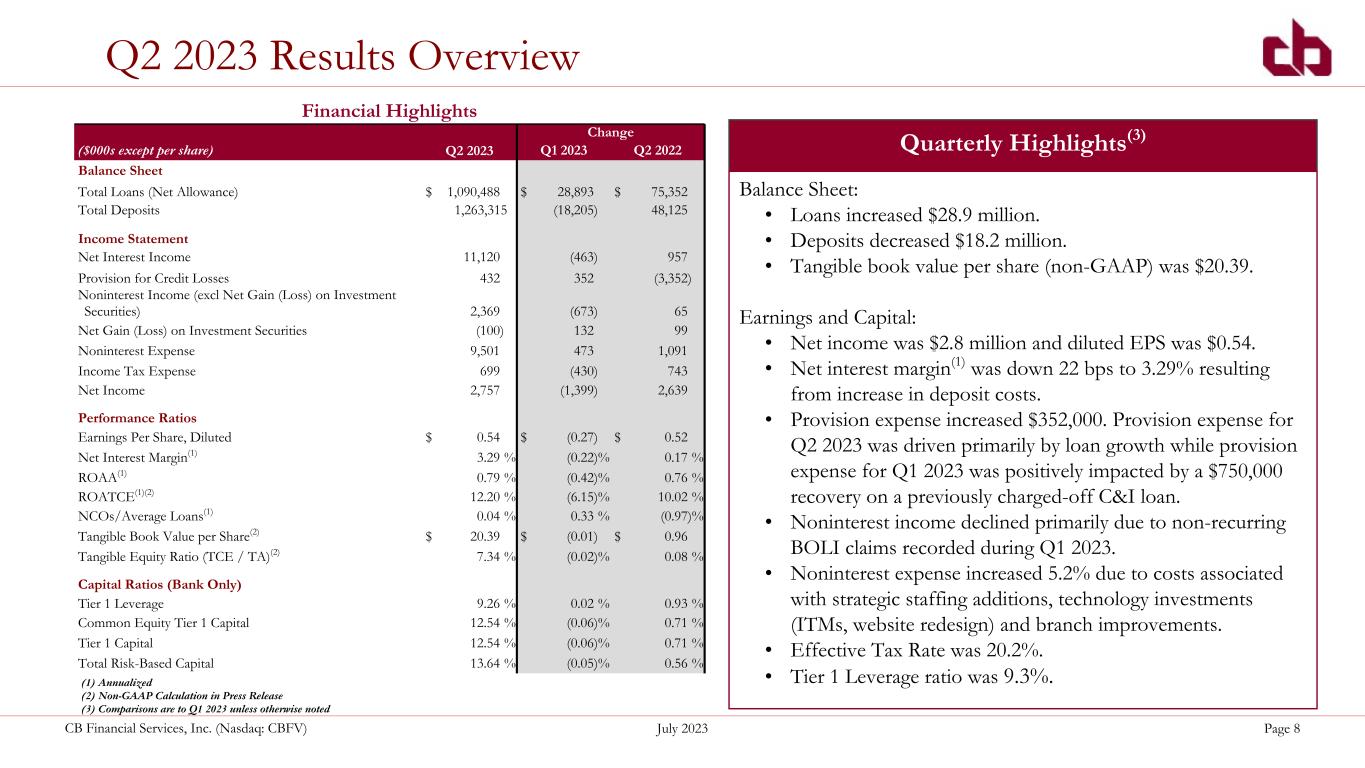 CB Financial Services, Inc. (Nasdaq: CBFV) July 2023 Page 7 Q2 2023 Highlights Earnings (for the three months ended June 30, 2023 unless otherwise noted) • Solid earnings. Net income was $2.8 million, with diluted earnings per share of $0.54. Pre-provision net revenue (PPNR) (non-GAAP) was $3.9 million. • Margin compression. Net interest income was $11.1 million, a decrease of 4.0% from Q1 2023 and an increase of 9.4% from Q2 2022. Net interest margin was 3.29%, down 22 bps from Q1 2023 and up 17 bps from Q2 2022 following seven quarters of NIM expansion. • Positive returns. Return on average tangible common equity (non-GAAP) was 12.20% for Q2 2023, compared 2.18% in Q2 2022. • Diversified revenue sources. Noninterest income represents 13.0% of operating revenues. Balance Sheet & Asset Quality (as of June 30, 2023 unless otherwise noted) • Robust loan growth. Net loans ($1.09 billion) increased 2.7% from March 31, 2023 and 5.1% from December 31, 2022. • Stable deposit base. Deposits ($1.26 billion) decreased 1.4% from March 31, 2023 and 0.4% from December 31, 2022. • High concentration of core deposits. Core deposits (non-time) were 87% of total deposits at June 30, 2023. • Limited wholesale funding. Borrowings to total assets was 2% at June 30, 2023. The Bank had no brokered deposits at June 30, 2023. • Strong credit quality. Nonperforming loans to total loans was 0.37% and nonperforming assets to total assets was 0.30% as of June 30, 2023. Annualized net charge-offs to average loans for the current quarter was 0.04%. Liquidity and Capital Strength (as of June 30, 2023 unless otherwise noted) • Significant available liquidity. Cash on deposit was $78.1 million and available borrowing capacity was $610.0 million. Available liquidity covers 240% of uninsured/non-collateralized deposits. • Low-risk deposit base. Insured/collateralized deposits account for 77% of total deposits. • Well-capitalized. The Bank's Tier 1 Leverage ratio was 9.3% at June 30, 2023, compared to 8.66% at December 31, 2022. • Increasing shareholder value. TBV per common share (non-GAAP) was $20.39 at June 30, 2023, compared to $19.00 at December 31, 2022.